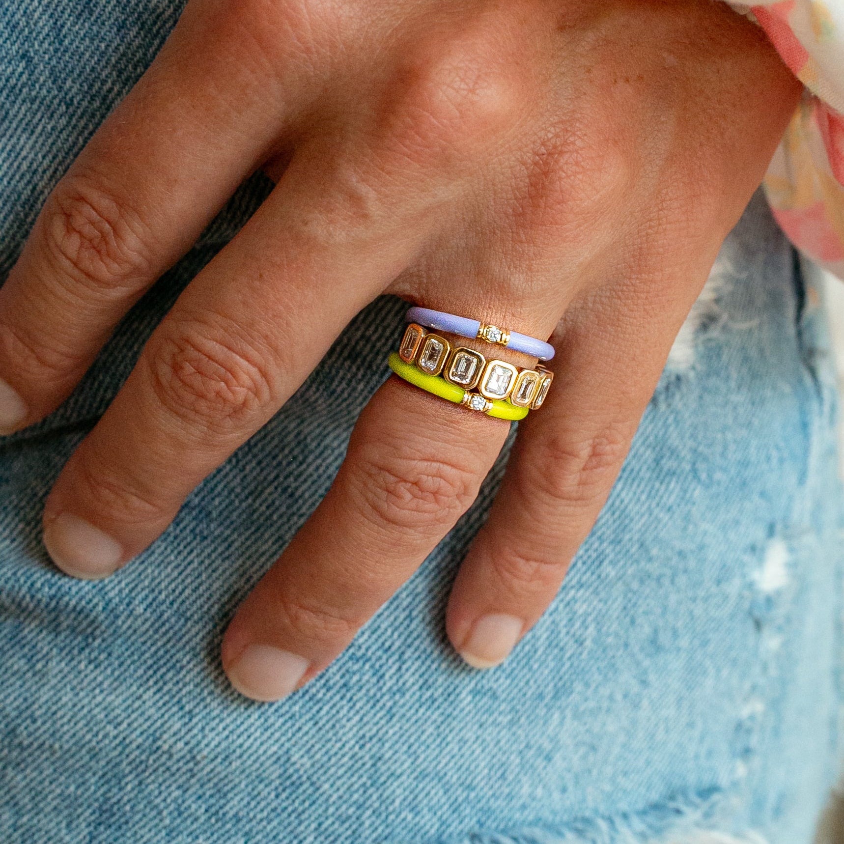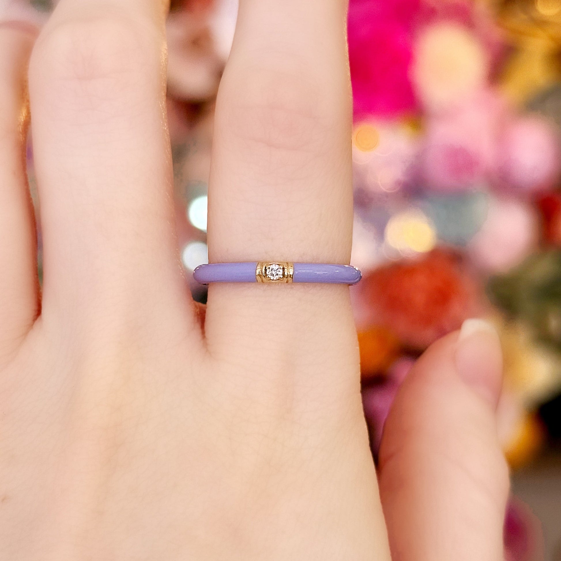 Add a POP of color and sparkle to your stack with a 14k gold enamel band in color Lilac. The diamonds has a .02 carat weight, F Color and Si Clarity. Band is 2.5mm wide.