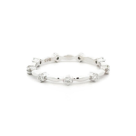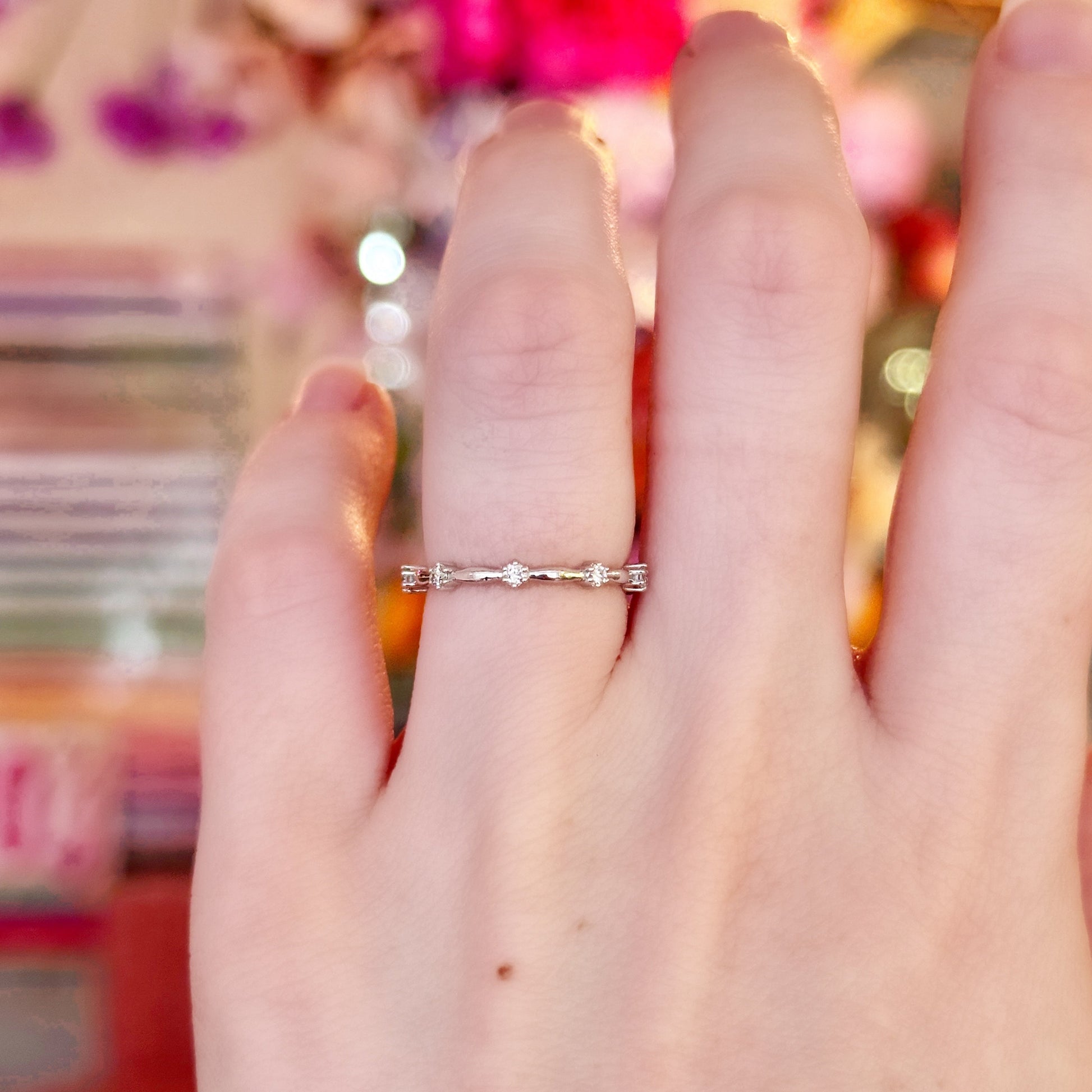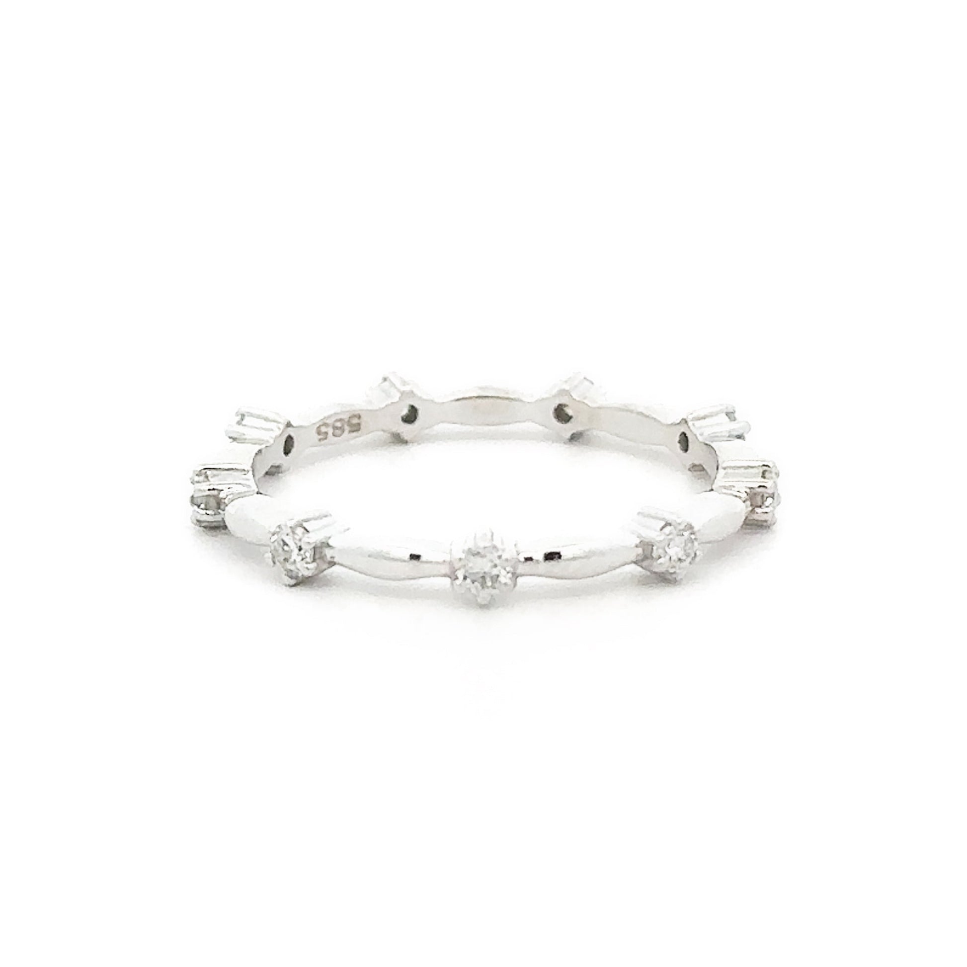 "Phoebe" in her classic form is a 14k white gold station eternity band (1.10 grams) featuring 0.220 carats of F color, SI1 clarity diamonds. Delicate and timeless, this ring adds a subtle sparkle to your everyday look and is perfect for stacking or wearing alone!