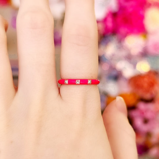 Add a POP of color and sparkle to your stack with a 14k gold enamel band in color Dahlia. Three diamonds have a .08 carat weight, F Color and Si Clarity. Band is 2.5mm wide.