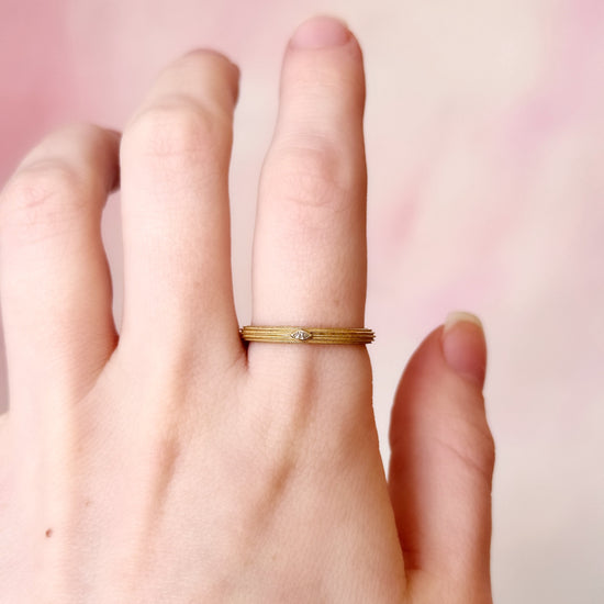 "Bobbi" in her classic form is a 14k yellow gold textured ring (1.70 grams) featuring 1 white diamond (0.020 carats, F color, SI1 clarity). A golden classic with just the right hint of sparkle!