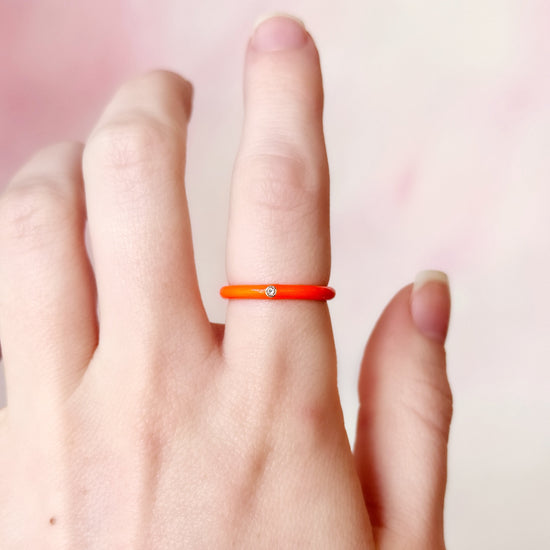 Add a POP of color and sparkle to your stack with a 14k gold enamel band in color Electric Orange. One .05 carat diamond, F Color and Si Clarity. Band is 2.5mm wide.