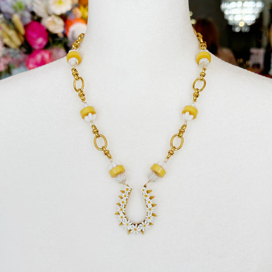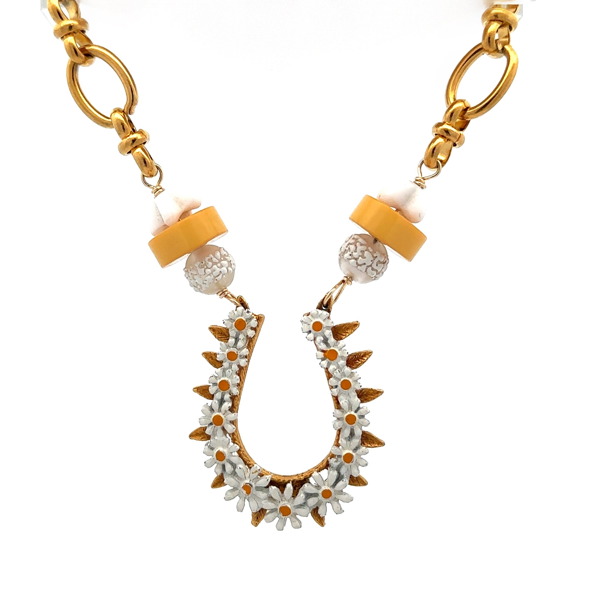 You’ve never aspired to be “normal” which is why you love this 1970's daisy horseshoe hung from gold chain accented with white and yellow beads!