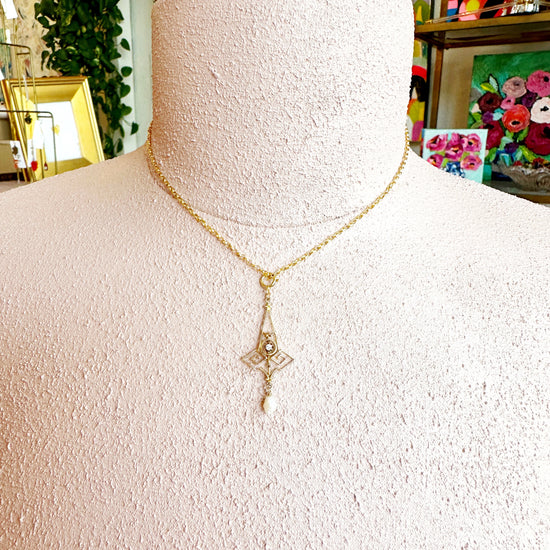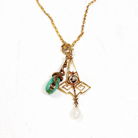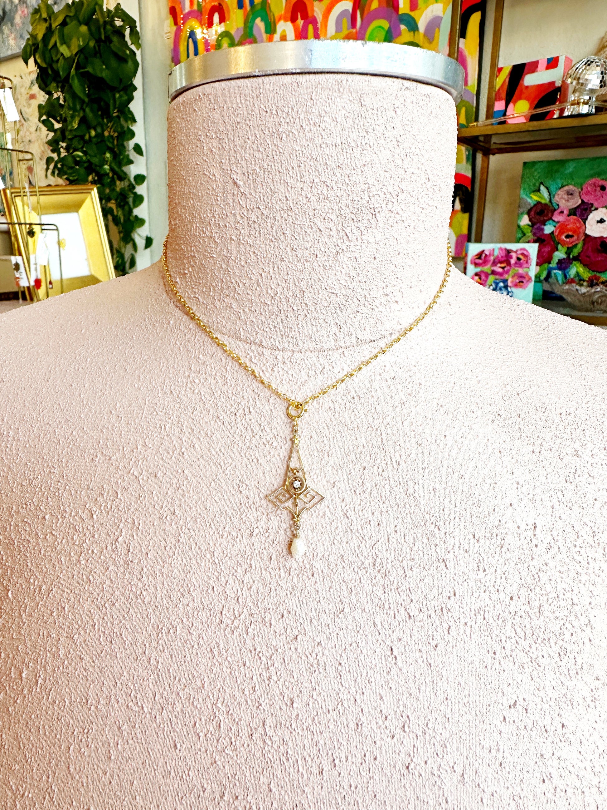 That sparkle in your eye is only matched by the sparkle in this late 1800's Victorian 14k diamond and seed pearl charm hung on a 14k gold fill chain!