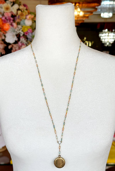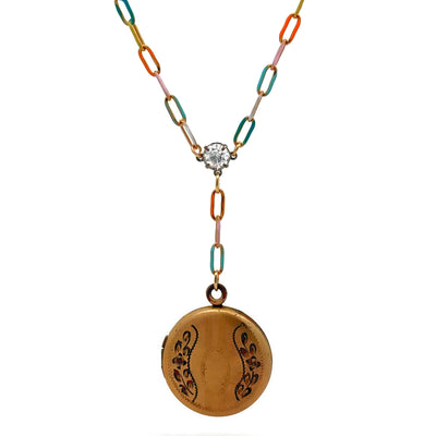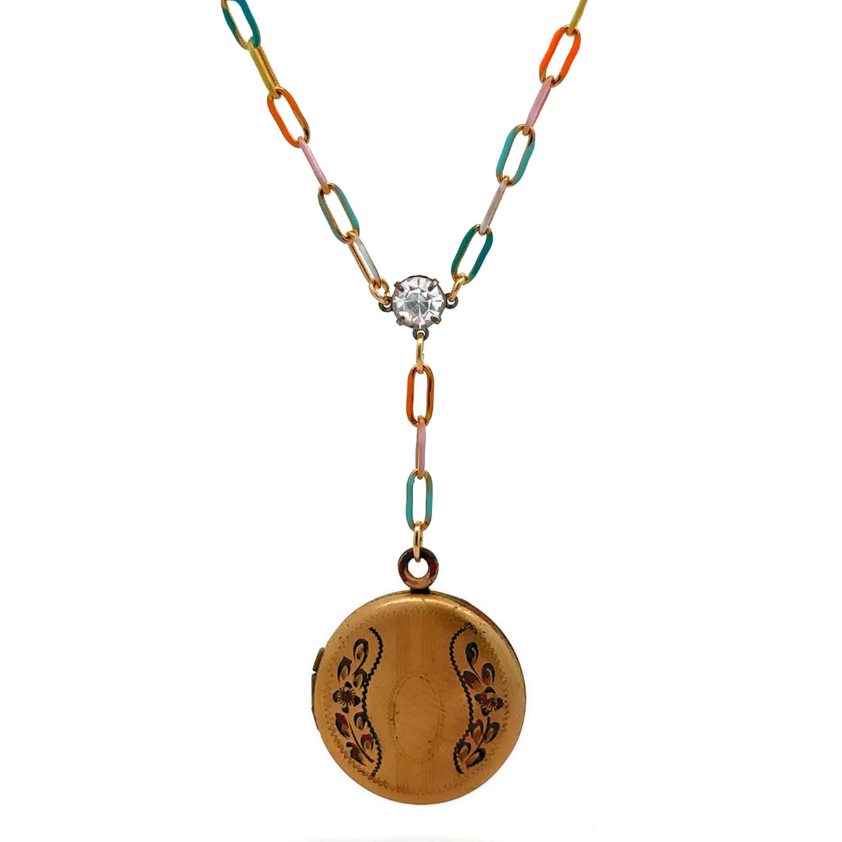 Victorian Era hand etched brass locket hung from a multicolored enamel y-drop chain!