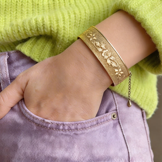 When you go gold, you go bold! Allow yourself to be fully seen in this turn of the century 14k gold-filled bangle bracelet with unique designs!