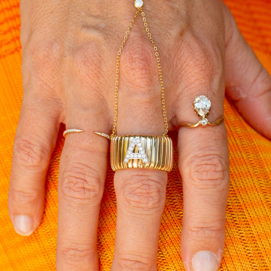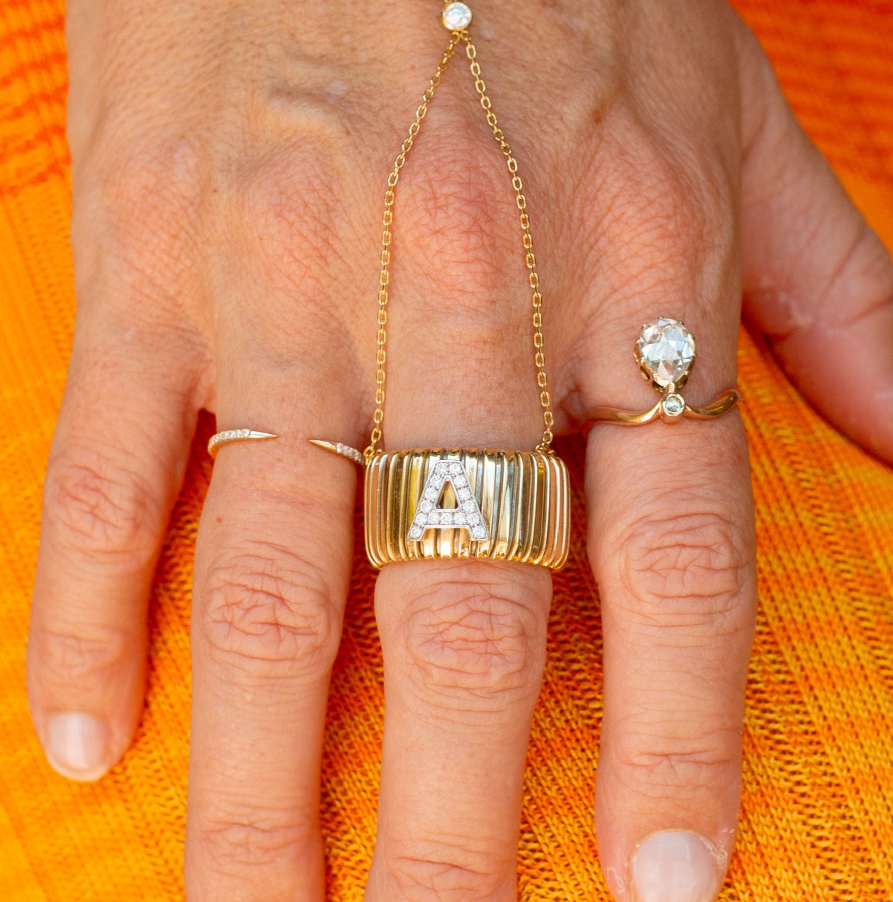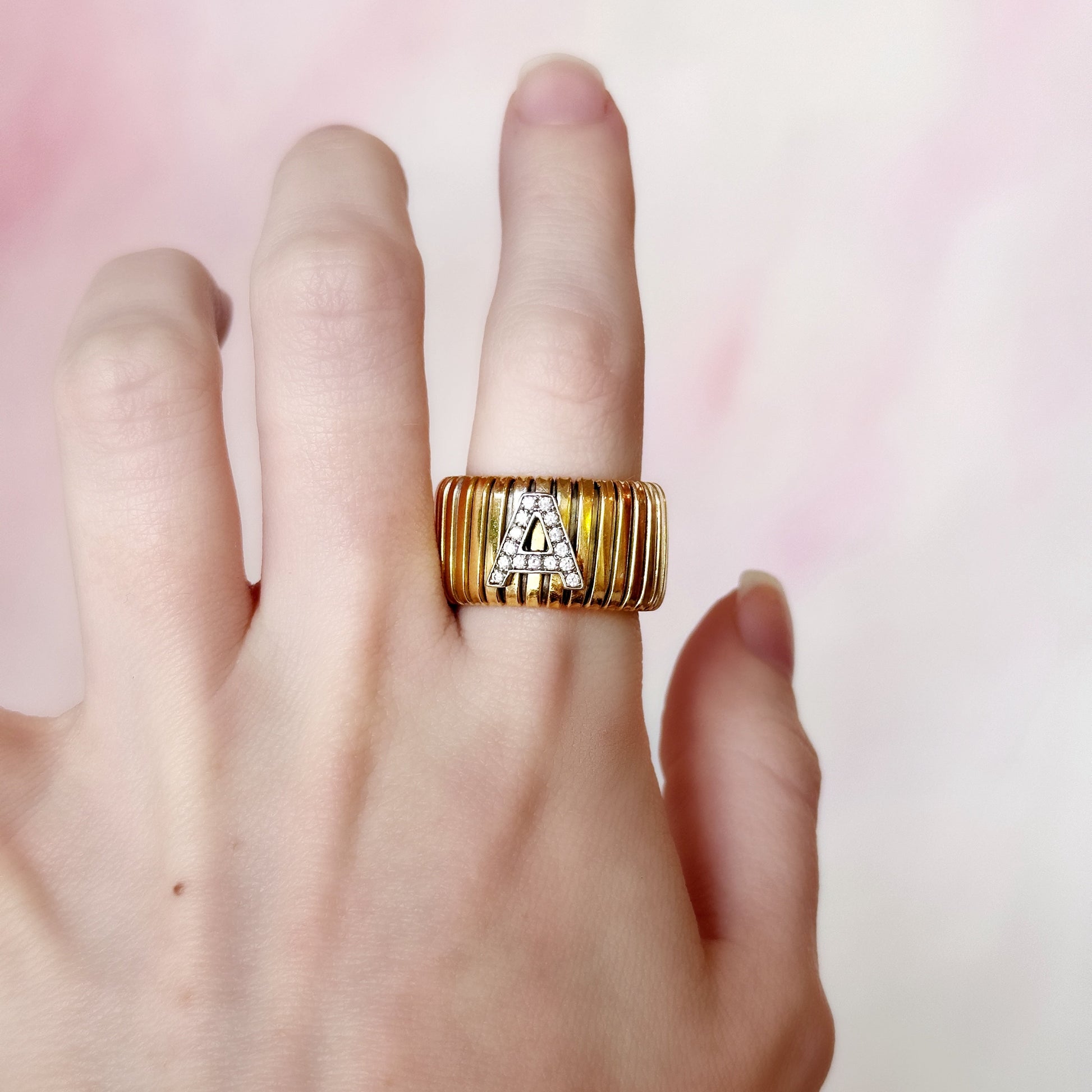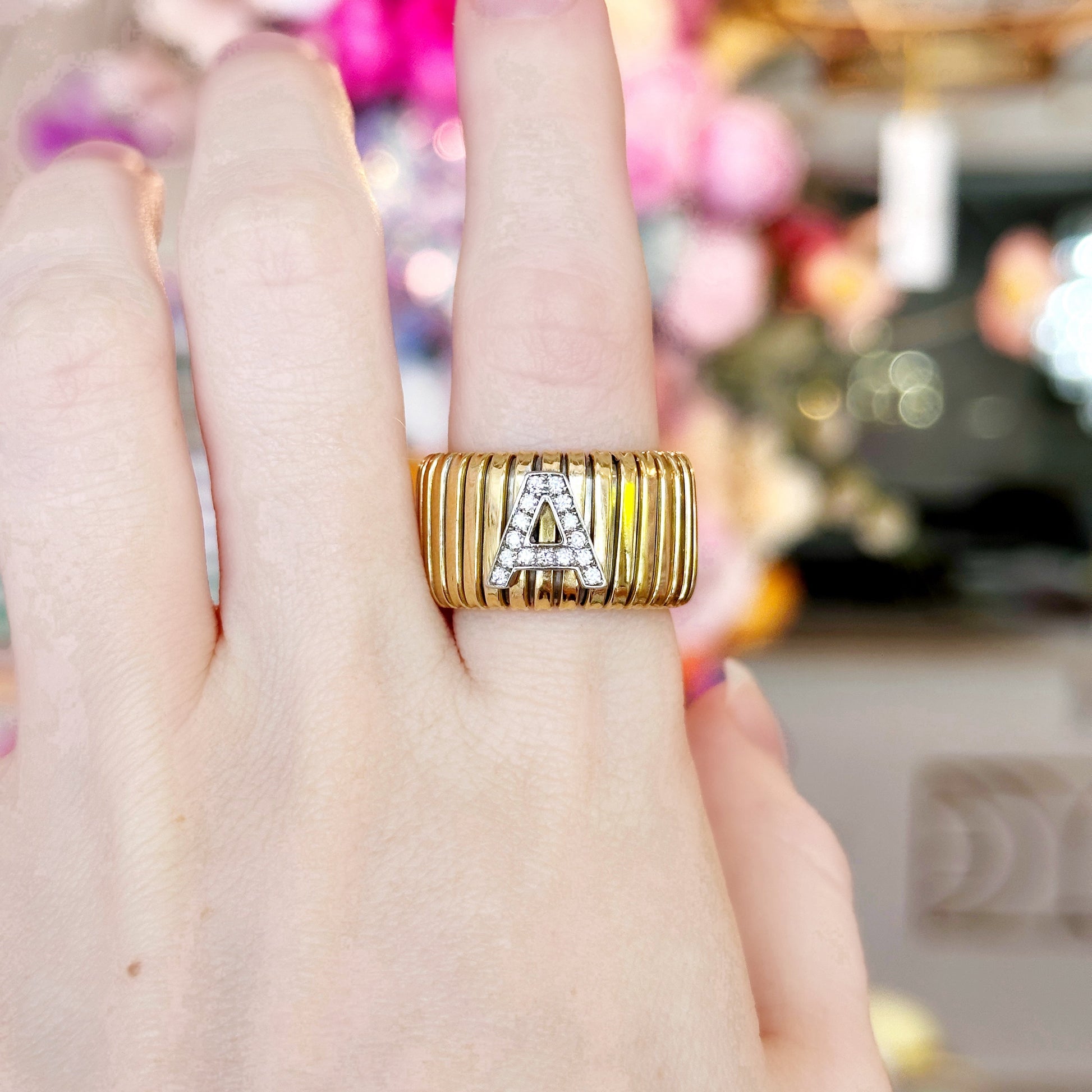 A bold nod to your personal style, this 1979 flexi initial ring is crafted in 18k yellow gold (9 grams) and set with natural diamonds. Its striking design and sparkling accents make it a statement piece that effortlessly combines vintage charm with modern flair.