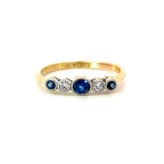 A 1920s handmade bezel-set diamond and sapphire ring set in 14k gold, size 6.25. Featuring approximately 1 carat total weight of sapphires and 0.33 carats total weight of diamonds, this vintage piece blends vibrant color with sparkling elegance.