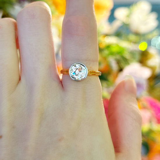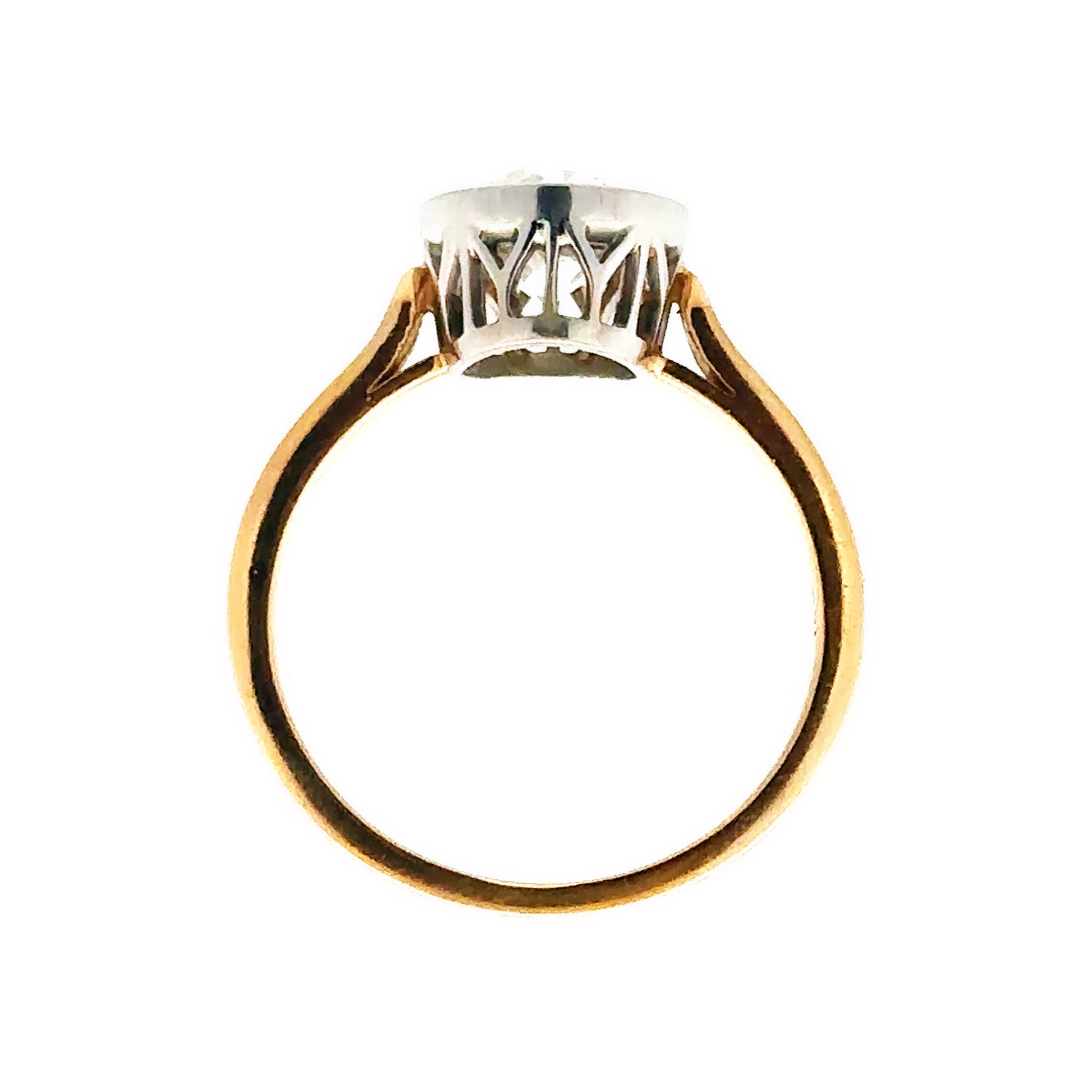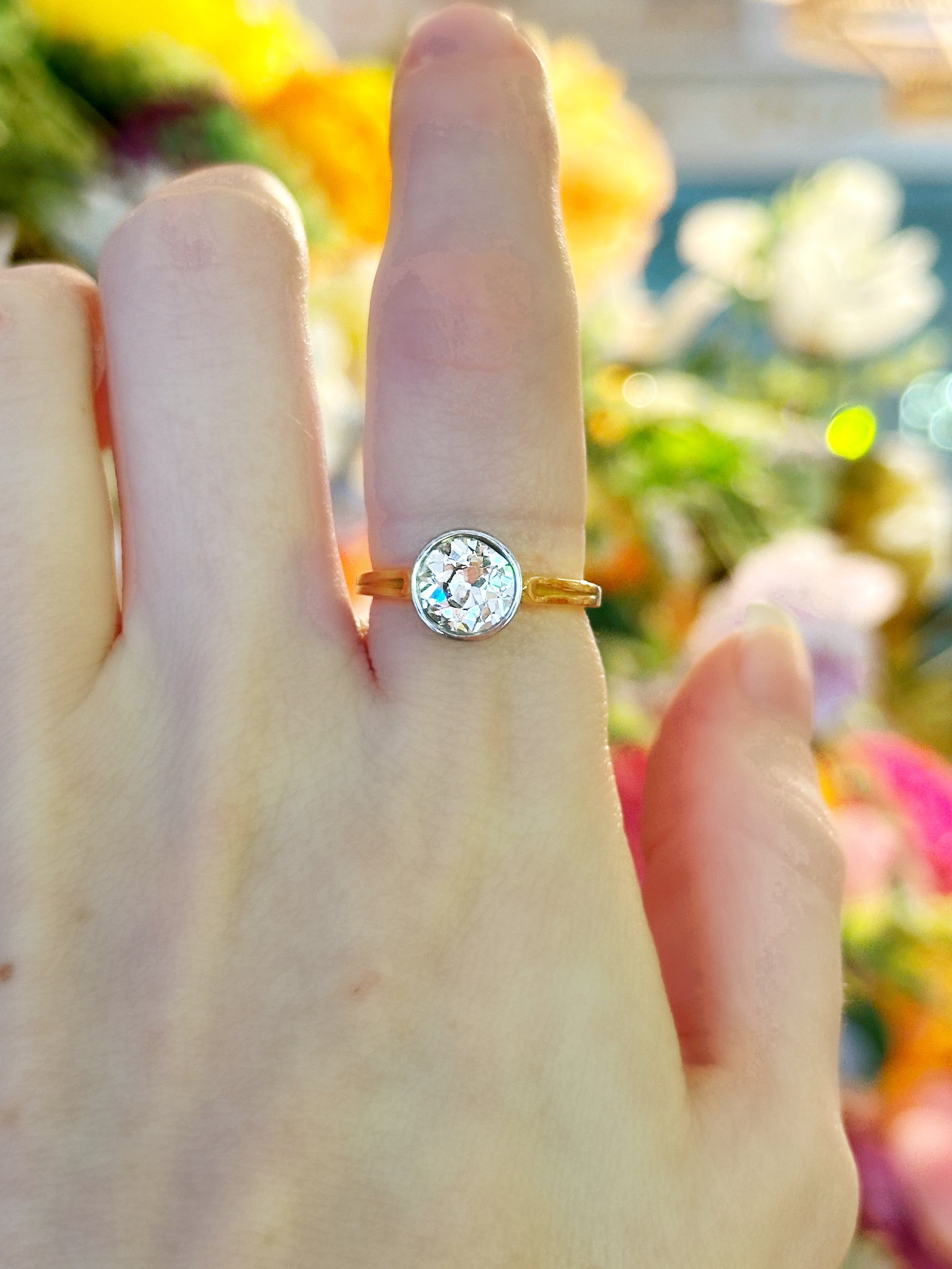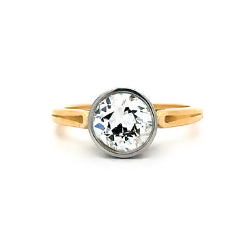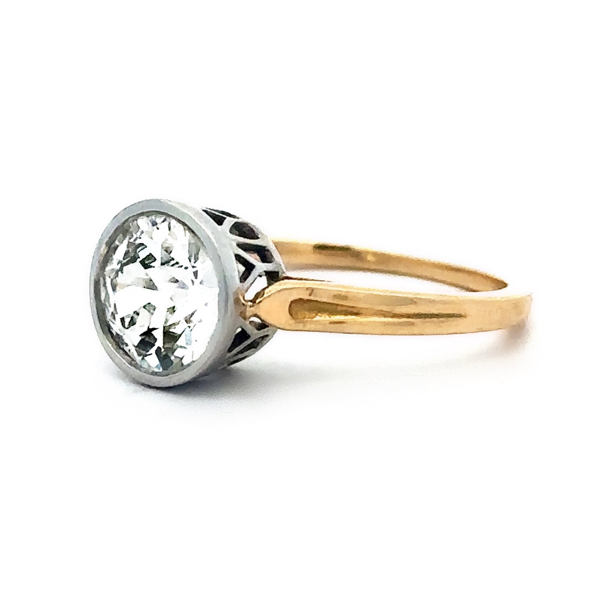 Our 1950s platinum and 18k yellow gold diamond ring exudes mid-century elegance and craftsmanship. Featuring a 1.45-carat bezel-set diamond in a hand-engraved setting, the combination of platinum and warm yellow gold highlights the intricate detailing and timeless sophistication characteristic of the era.