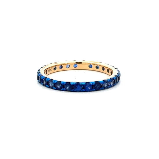 "Beatrix" in her classic form is a 14k yellow gold and oxidized natural blue sapphire eternity band featuring approximately 0.405 total carats. The deep blue sapphires encircle the band, creating a bold, striking piece.