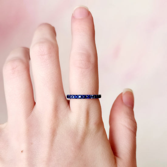 "Beatrix" in her classic form is a 14k yellow gold and oxidized natural blue sapphire eternity band featuring approximately 0.405 total carats. The deep blue sapphires encircle the band, creating a bold, striking piece.