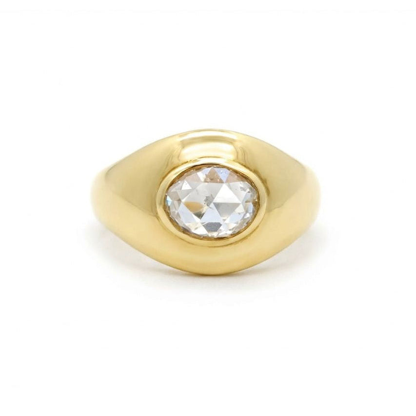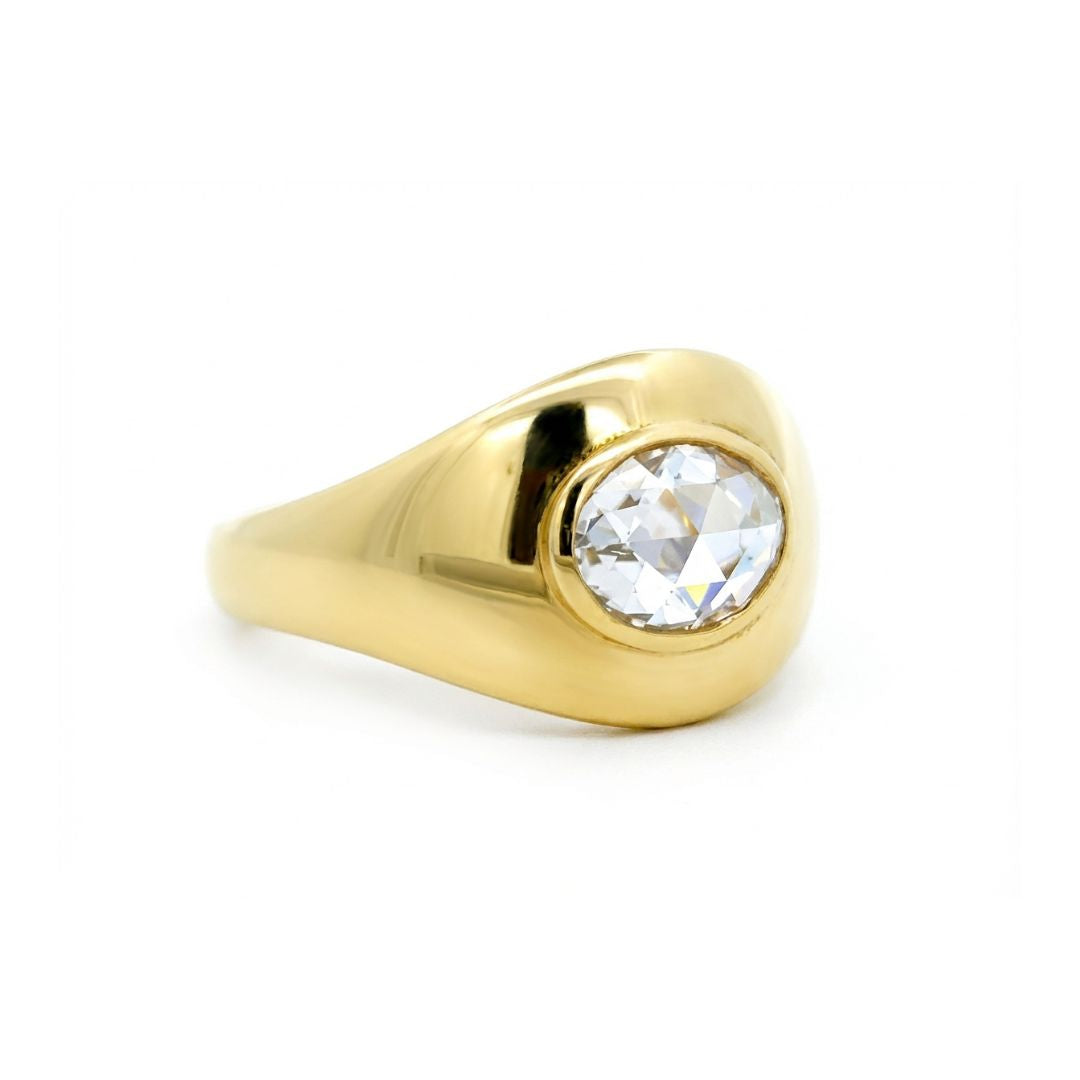 Our vintage 1970s rose-cut oval diamond ring carries a timeless elegance with its soft, luminous sparkle. Set in 14k yellow gold and weighing 5.80 grams, it showcases a 1.05-carat diamond (H color, VS clarity). The rose-cut’s subtle shimmer and oval shape lend the piece a graceful, understated beauty that feels both classic and effortlessly chic.