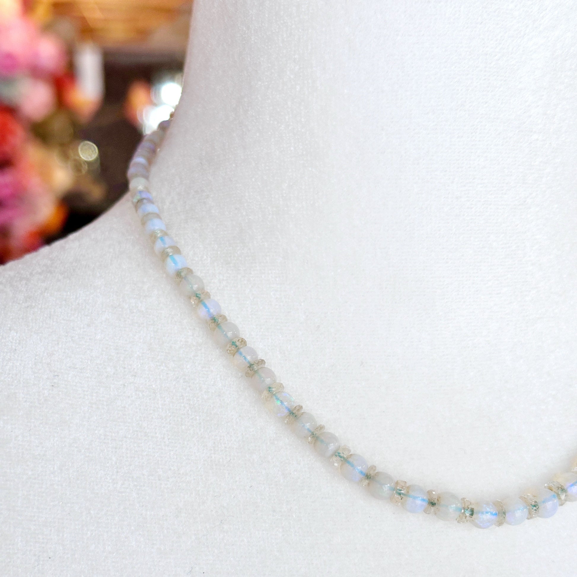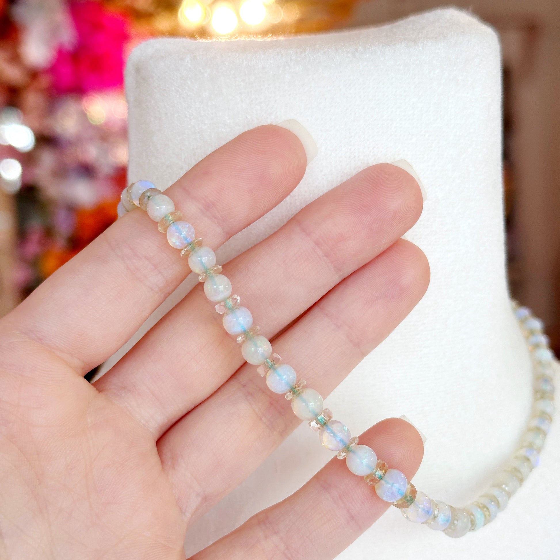 A necklace of 1880s hand-carved Australian opals and antique quartz crystal, elegantly restrung on modern turquoise silk. Finished with 14/20 yellow gold, it measures 14 inches with a 2-inch extender for a total length of 16 inches.