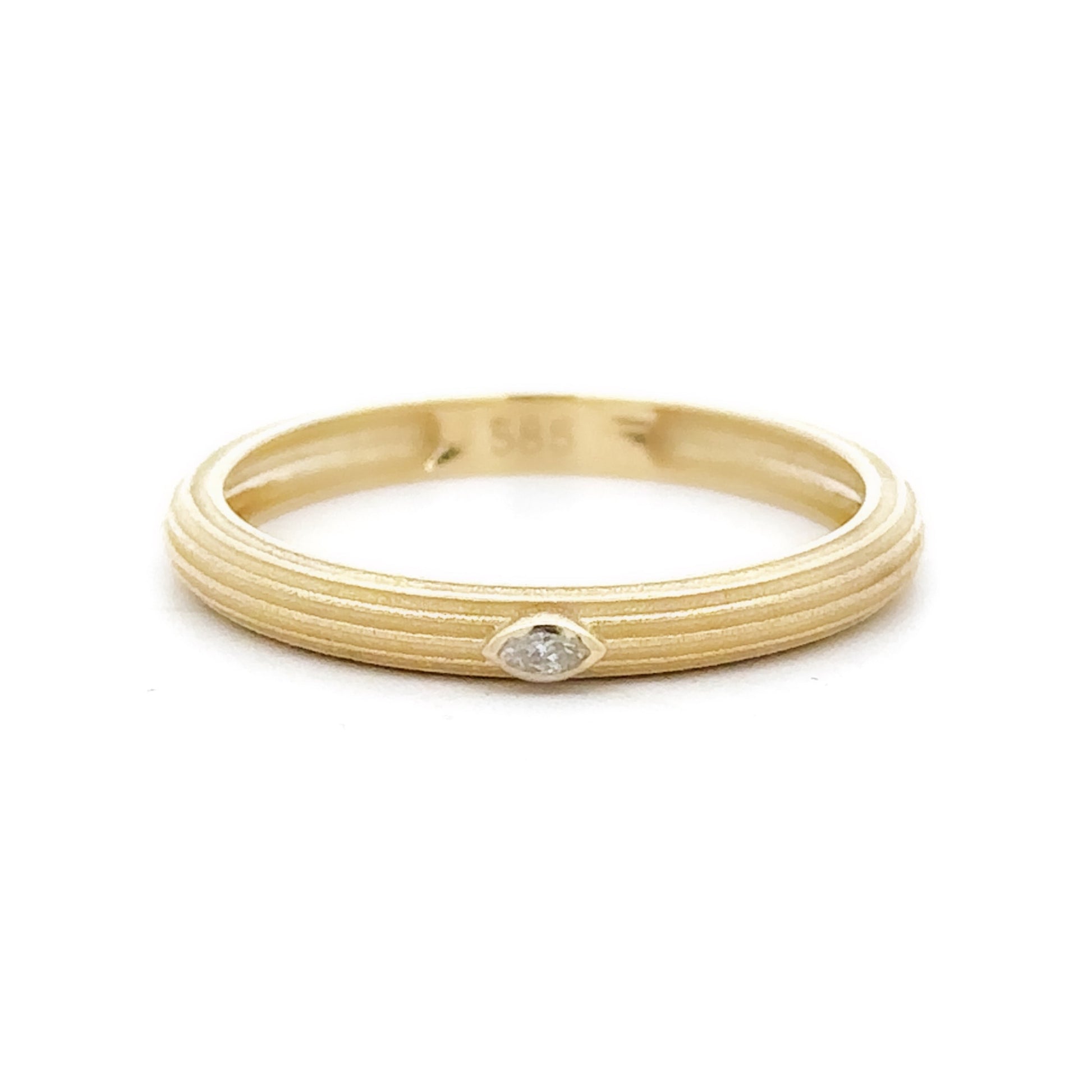 "Bobbi" in her classic form is a 14k yellow gold textured ring (1.70 grams) featuring 1 white diamond (0.020 carats, F color, SI1 clarity). A golden classic with just the right hint of sparkle!