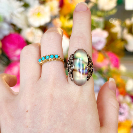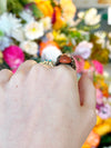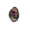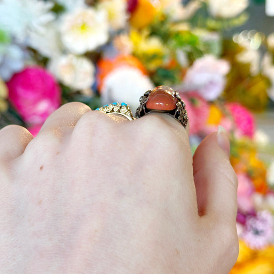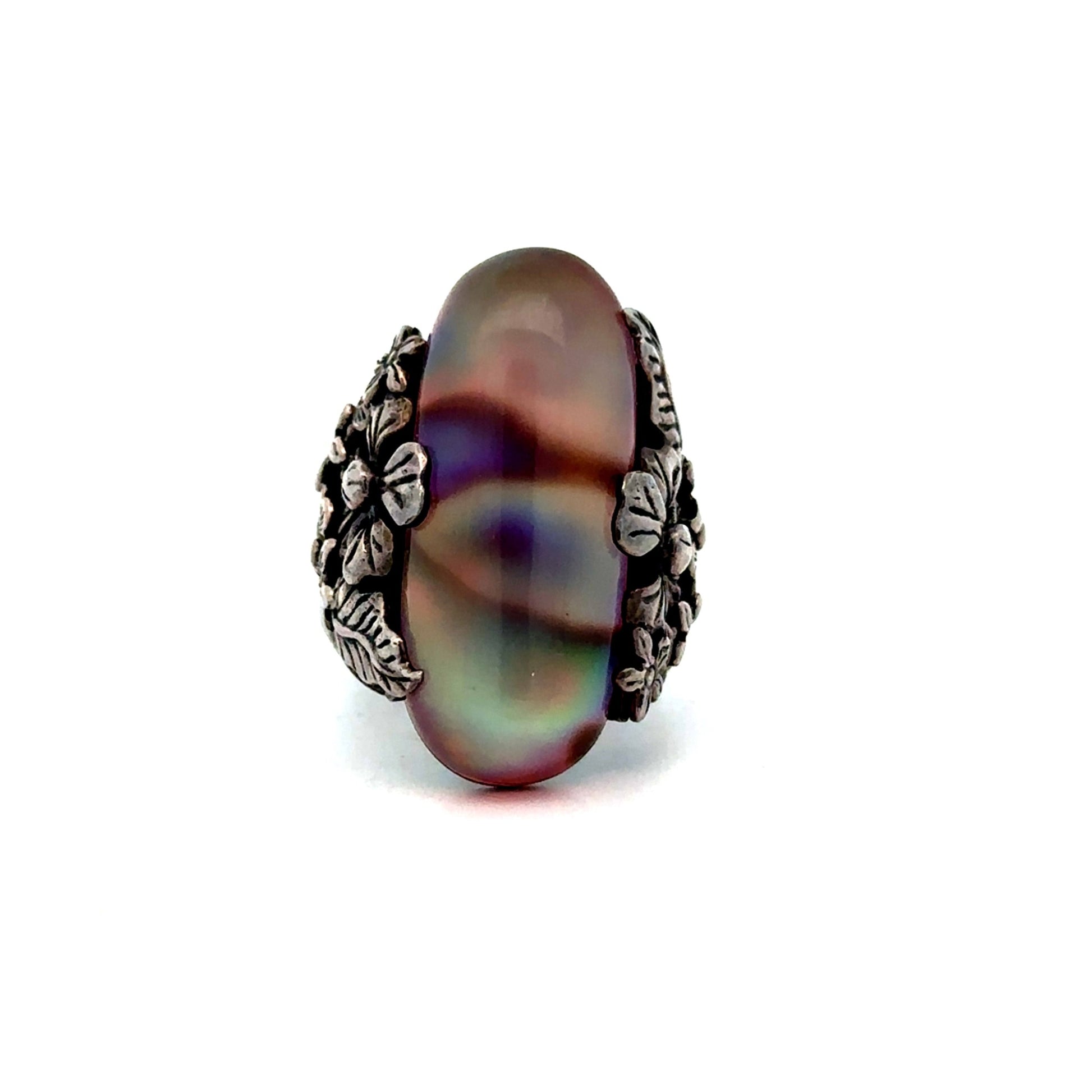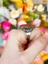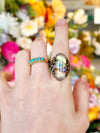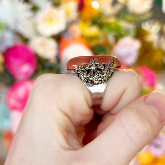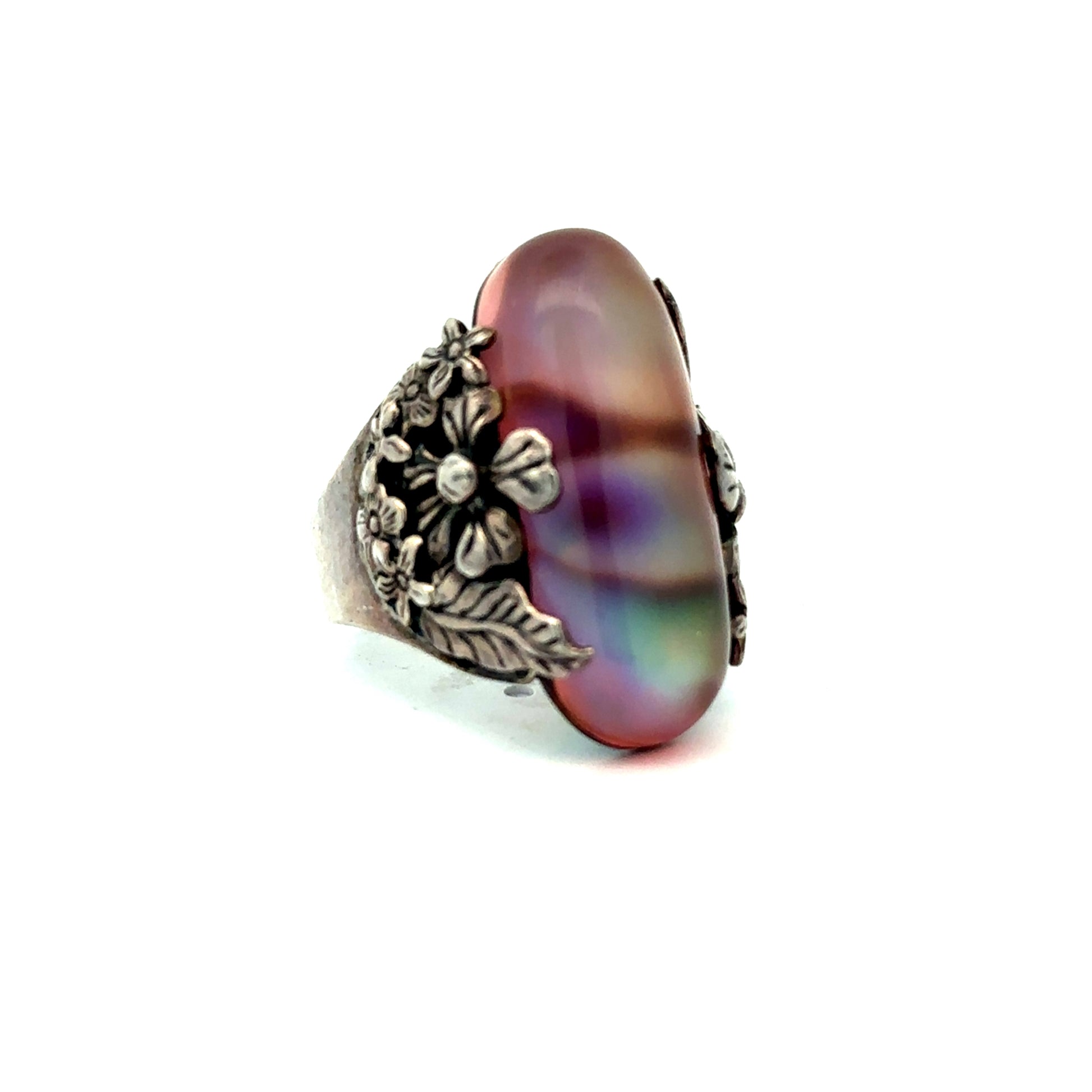 1970's Sterling Silver ring accented with hand carved details, Abalone and a light pink top stone.