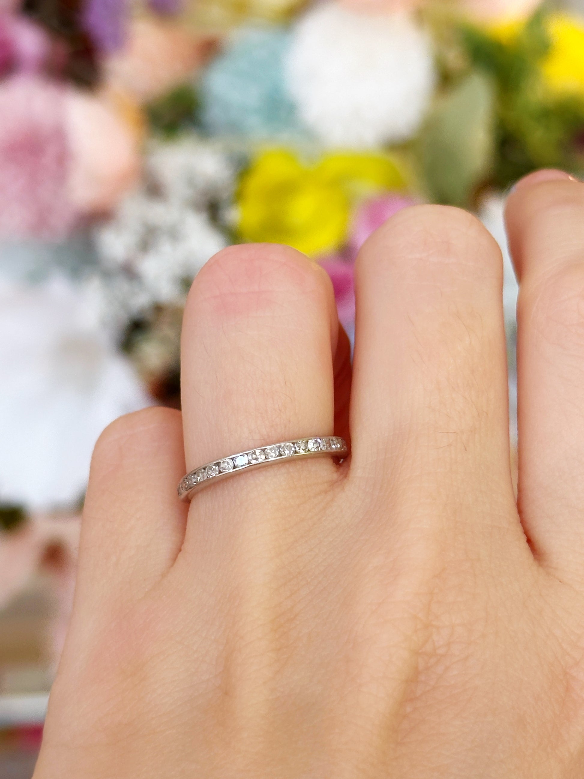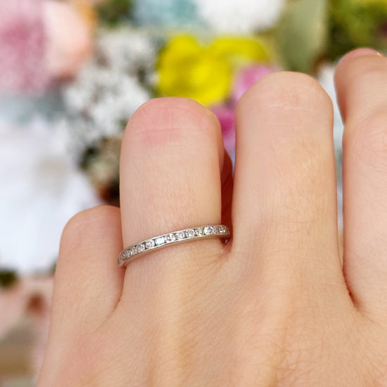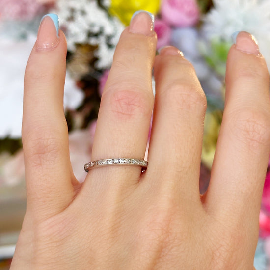 An Art Deco platinum channel-set diamond eternity band featuring 1.25 carats total weight. Sleek, geometric, and timeless—this band sparkles with vintage elegance!