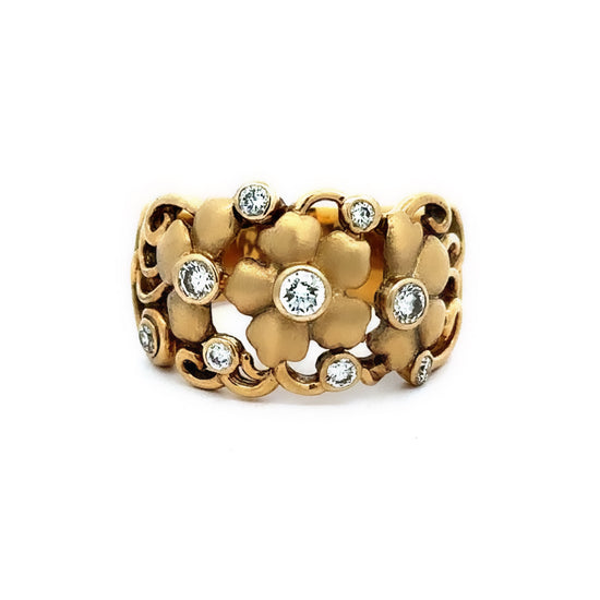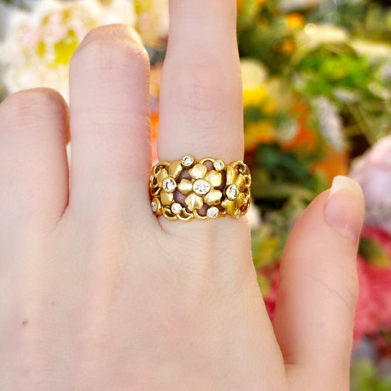 A 1970s 18k yellow gold statement ring featuring 9 diamonds totaling 0.50 carats, designed in a bold floral motif. A retro treasure that blooms with sparkle and style!