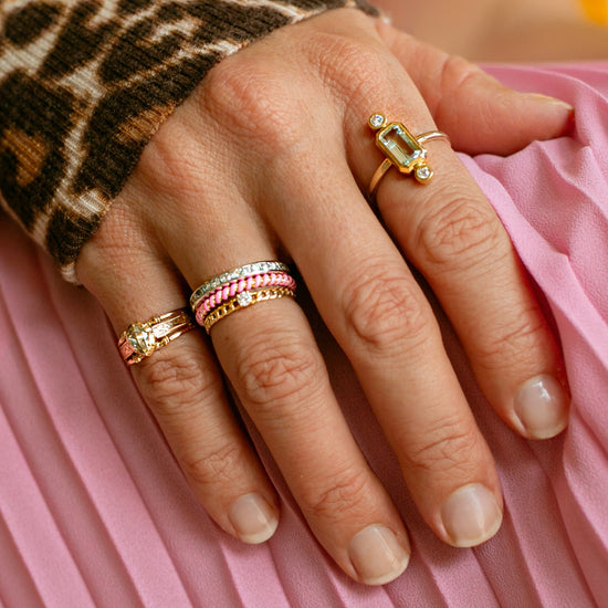 Casual Carats 14k yellow gold and bubblegum pink ceramic twist band. Mix and match these enamel bands to craft a stack that reflects your personal style.