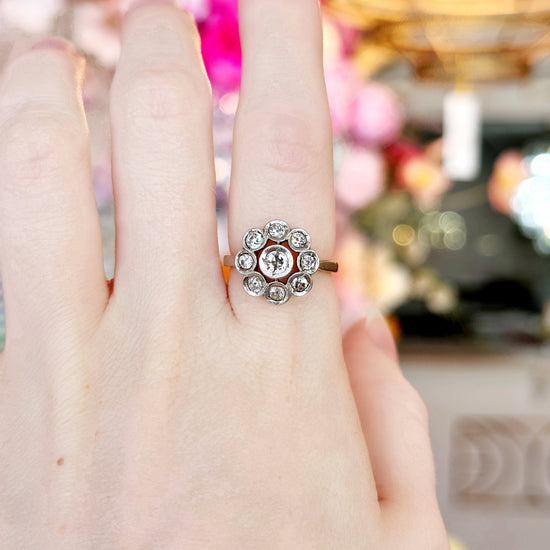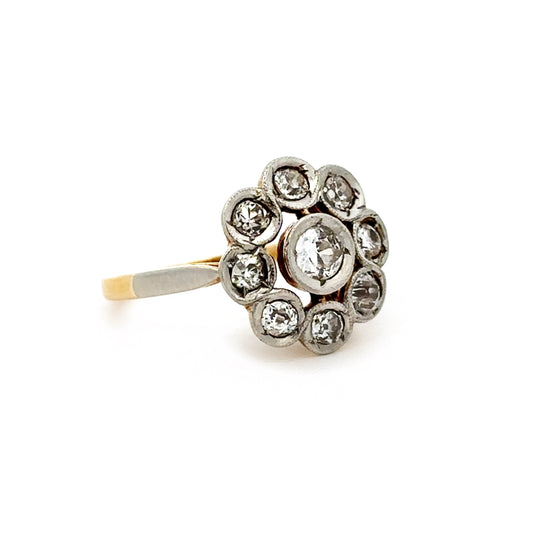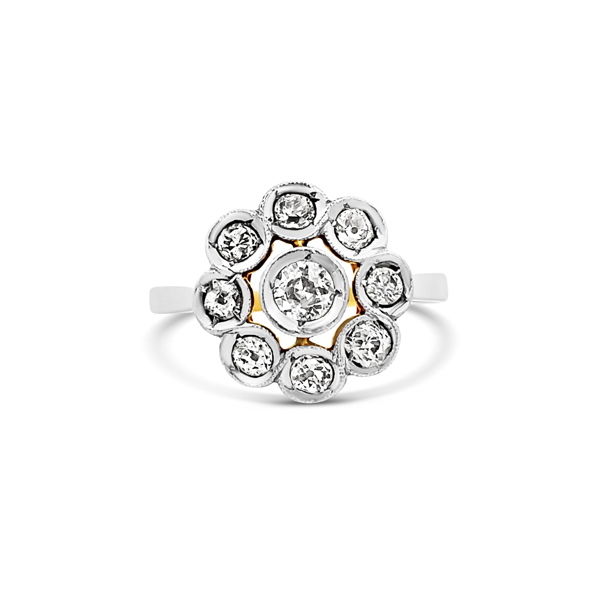 A 1900s Victorian ring crafted in 15k yellow and white gold, weighing 3.30 grams and set with .90 carats of old mine cut diamonds. Rich in detail and warmth, this antique piece blends two tones of gold for a subtle, timeless contrast.