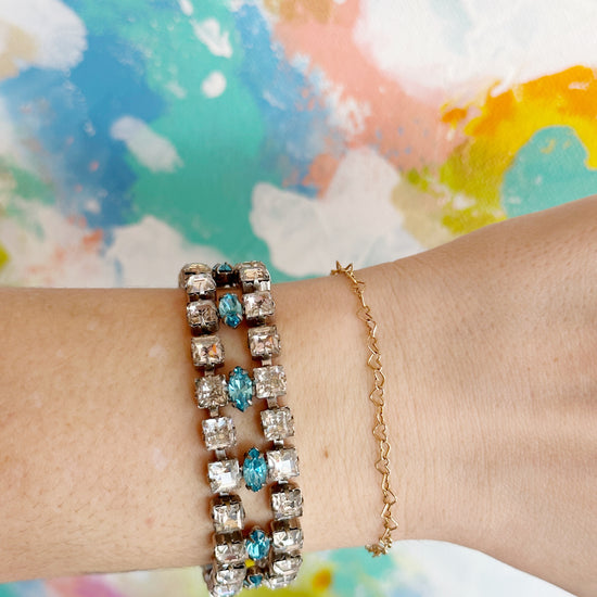 Your life is a pop of color in this world, so naturally your jewelry would be too! This 1950's blue and silver rhinestone bracelet is destined to be the vintage piece in an eclectic stack. Pair it with diamonds, gold, and perhaps a delicate permanent bracelet for even more color splash!