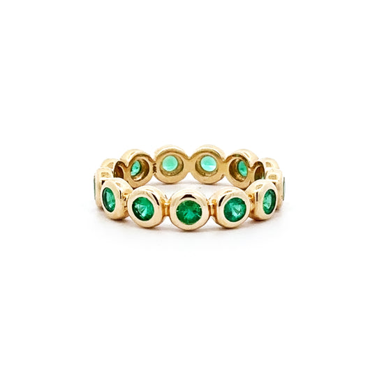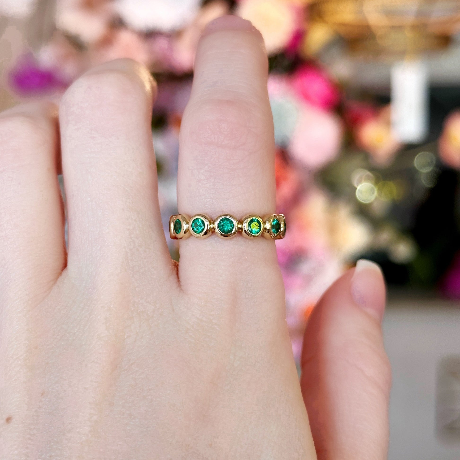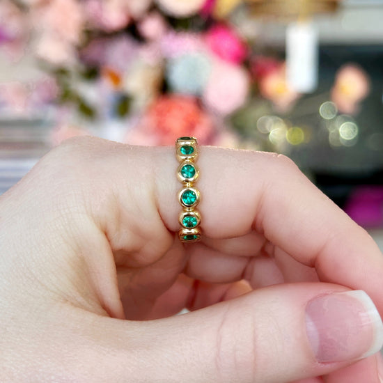 "Elara" in her classic form is a 14k yellow gold eternity band featuring 13 natural Zambian emeralds totaling approximately 0.78 carats. A vibrant, green-lined sparkle that wraps perfectly around your finger!