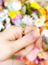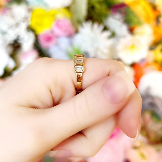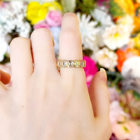 "Junie" in her classic form is a 14k yellow gold half-eternity band (4.5 grams) featuring 8 emerald-cut, bezel-set diamonds totaling approximately 1.34 carats. Sleek and sophisticated, it’s the perfect balance of bold gold and bright sparkle!