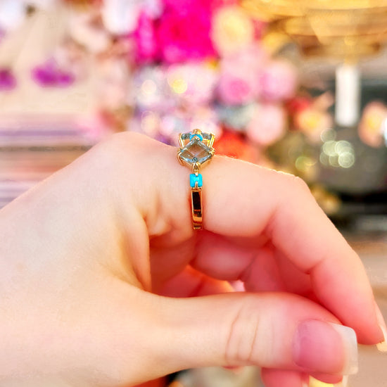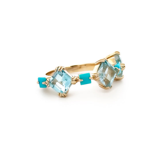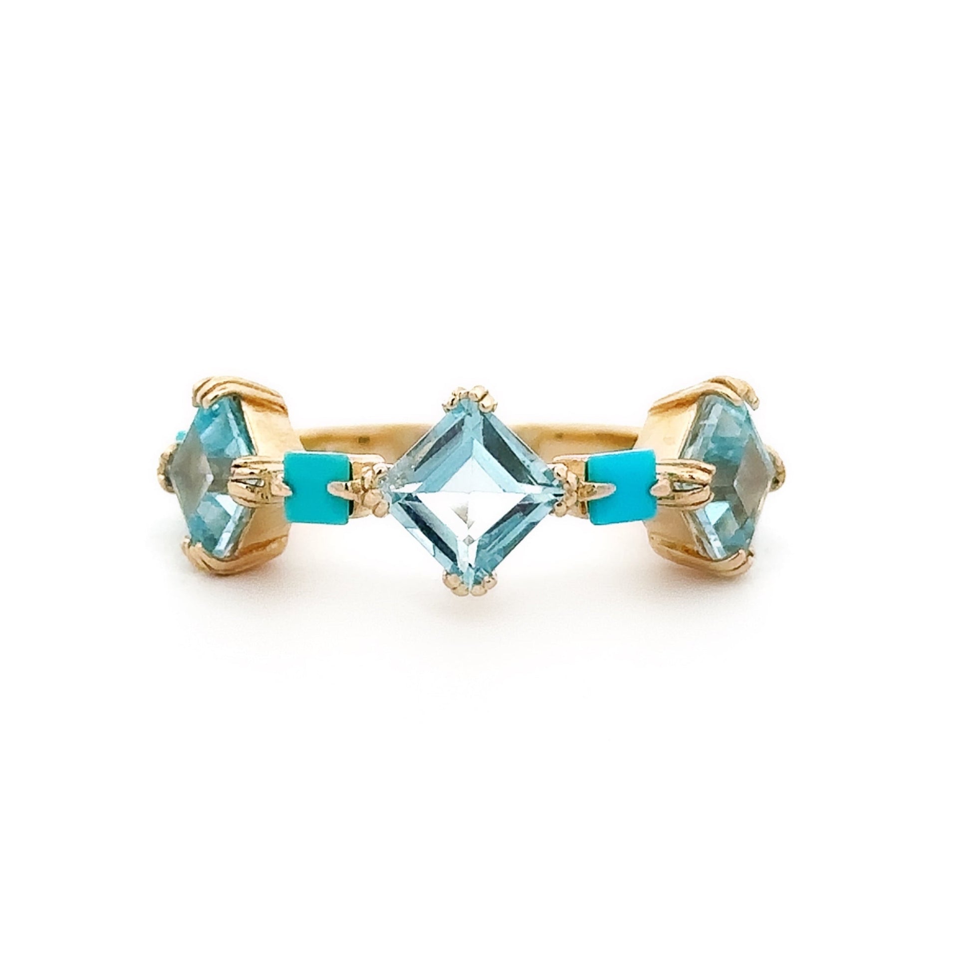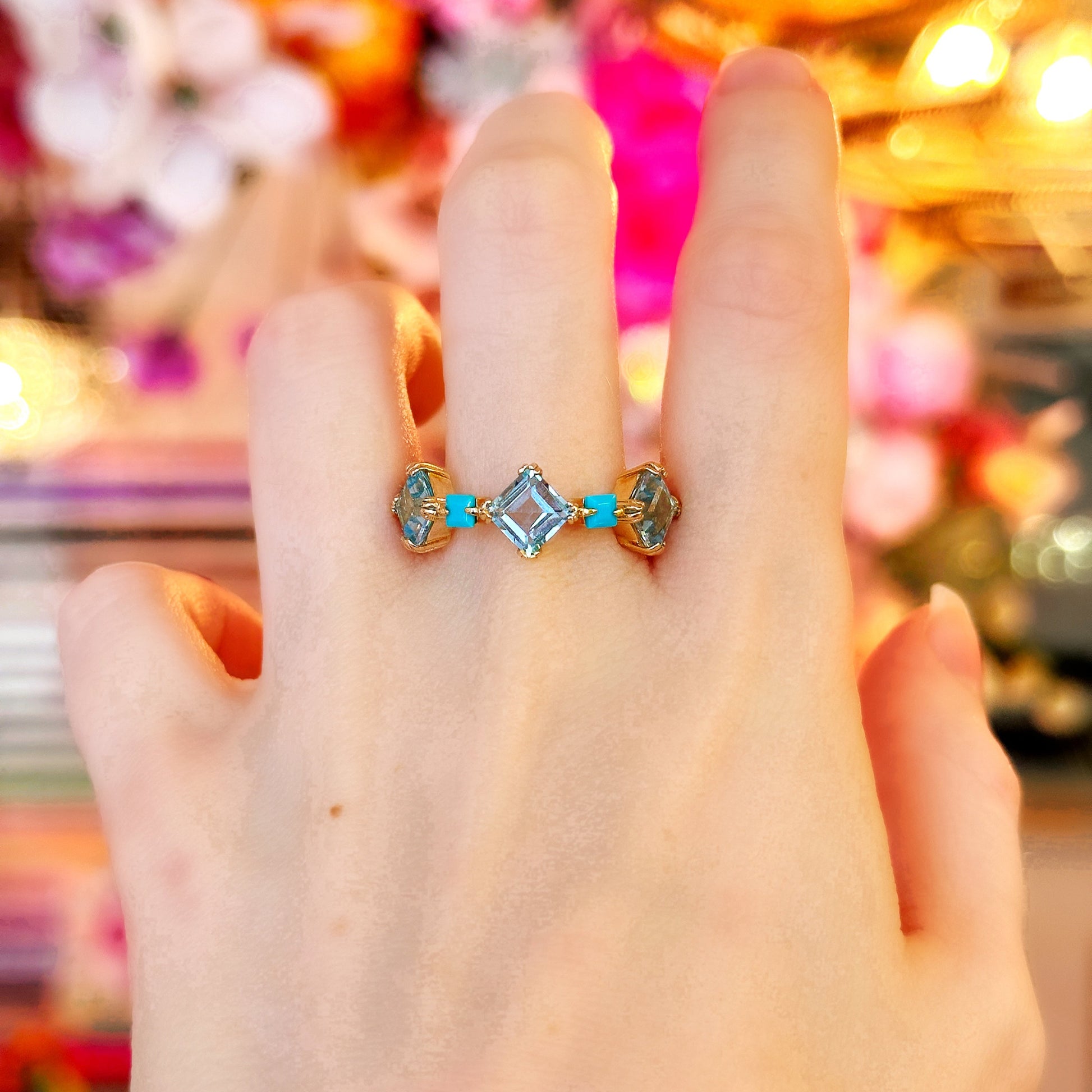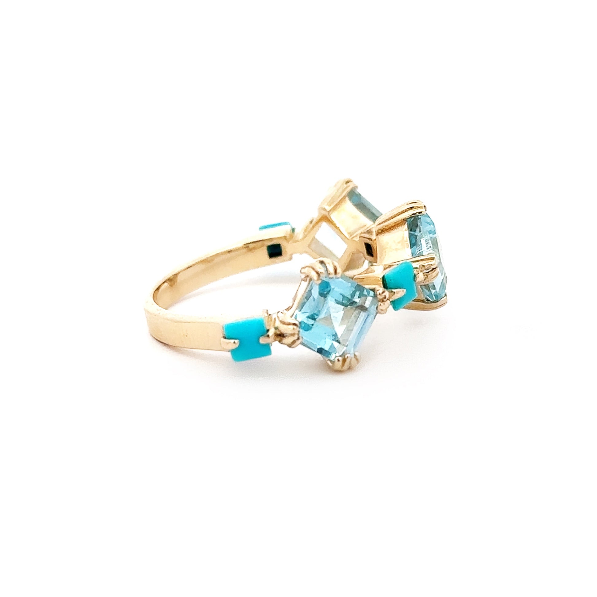 Our Aquamarine and Turquoise Ring features three A+ grade, clean square step-cut aquamarines paired with natural turquoise, set in 14k yellow gold weighing 4 grams. This heirloom-quality design combines serene blue tones with classic elegance, perfect for everyday wear and to be cherished for generations.