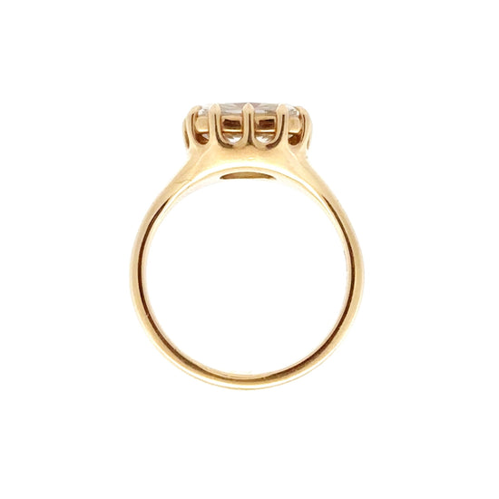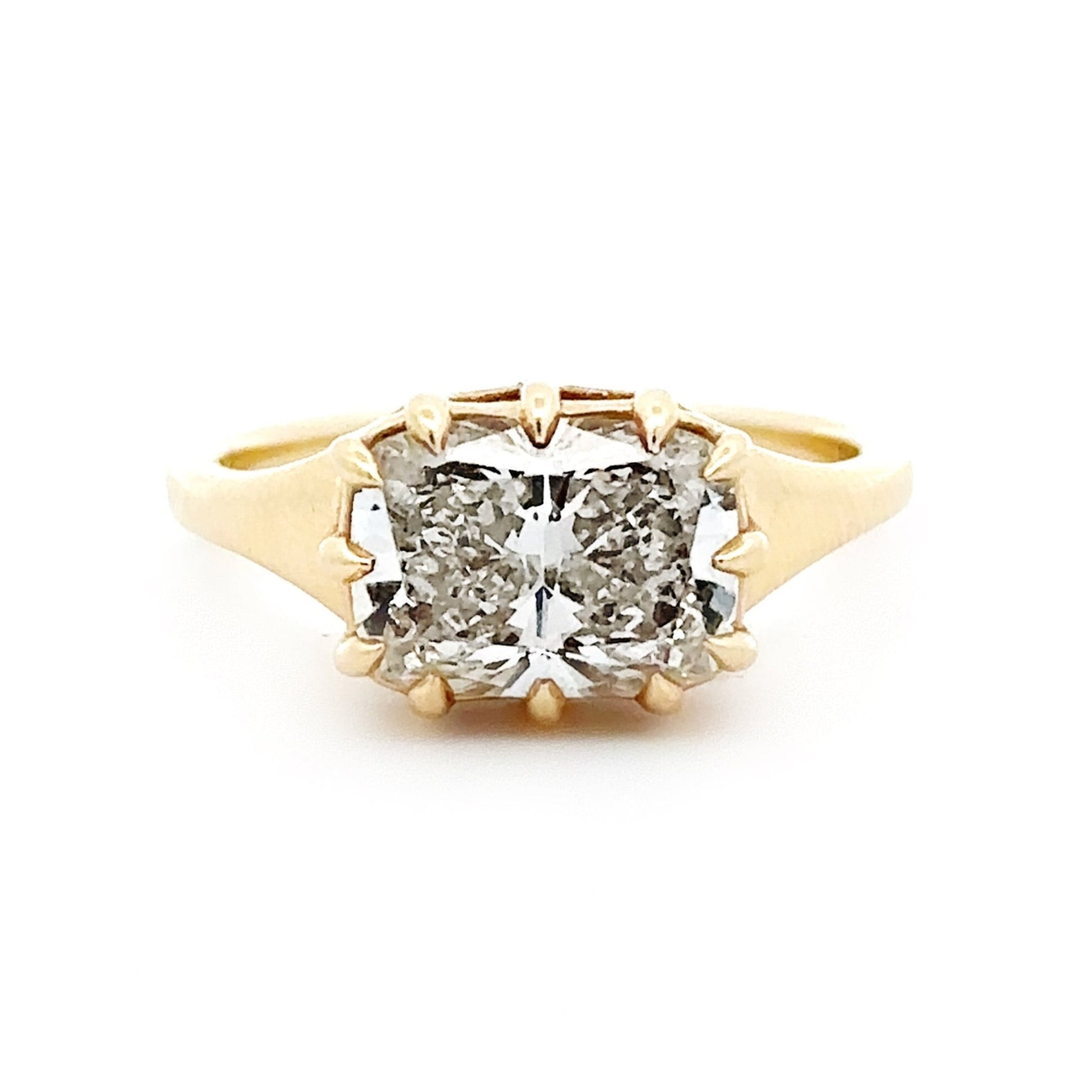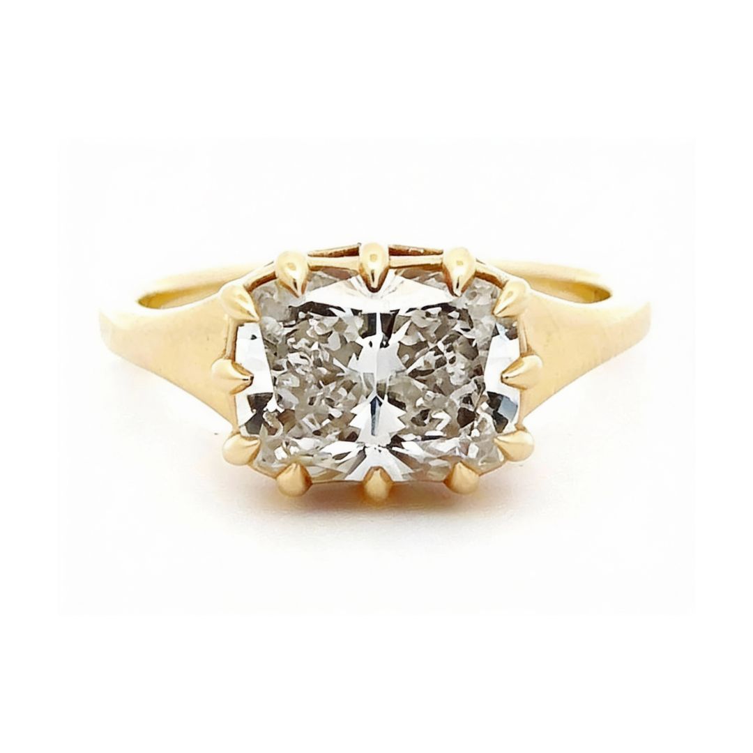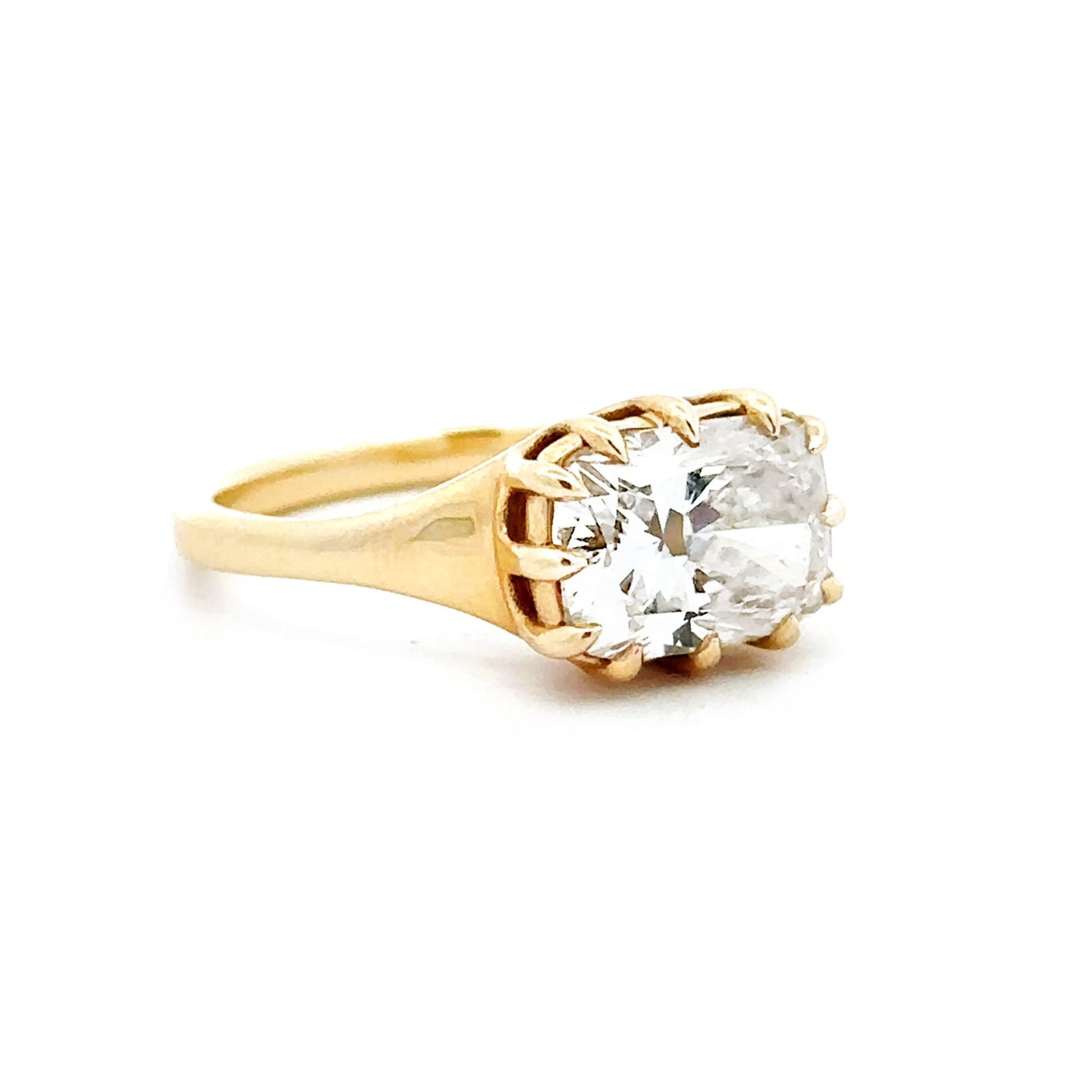Shown here is a ring featuring a 2.54 ct cushion brilliant cut lab diamond, graded H color and VS1 clarity. The stone is beautifully secured in a 14k yellow gold basket claw setting, creating a timeless and refined design.