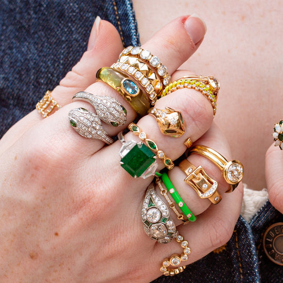 "Greer" in her classic form is a 14k yellow gold ring featuring approximately 0.21 total carats of natural diamonds (VS1 clarity, EF color) and approximately 0.42 total carats of marquise-cut emeralds. A sparkling and colorful combo that adds a cheerful pop to any stack!