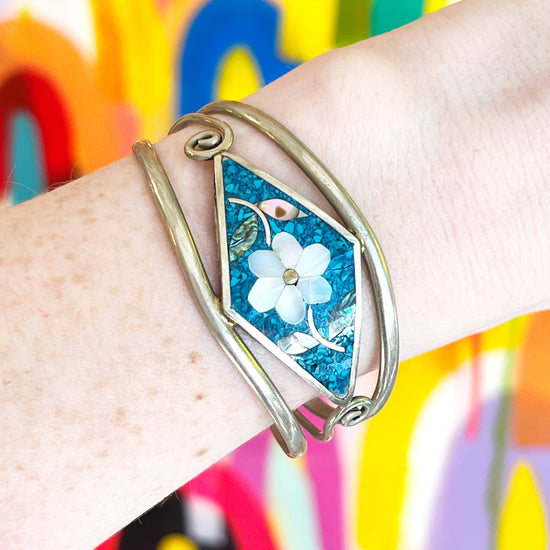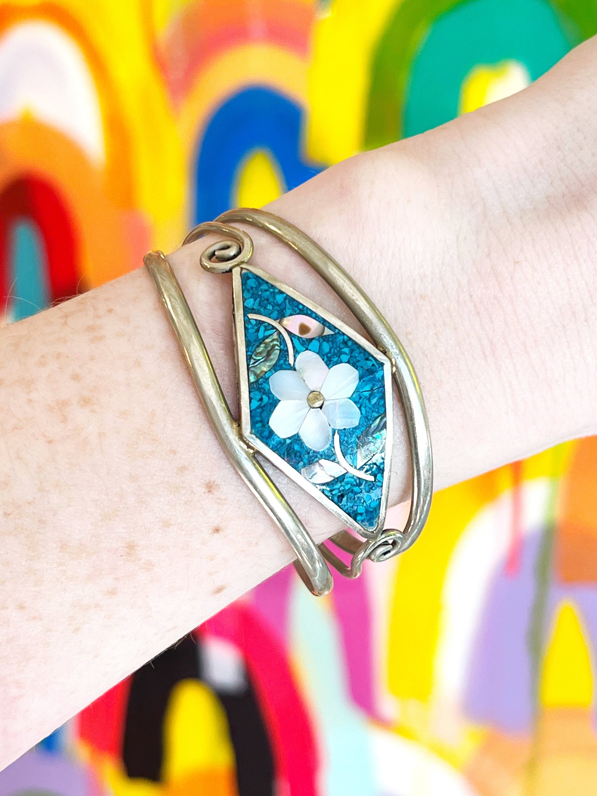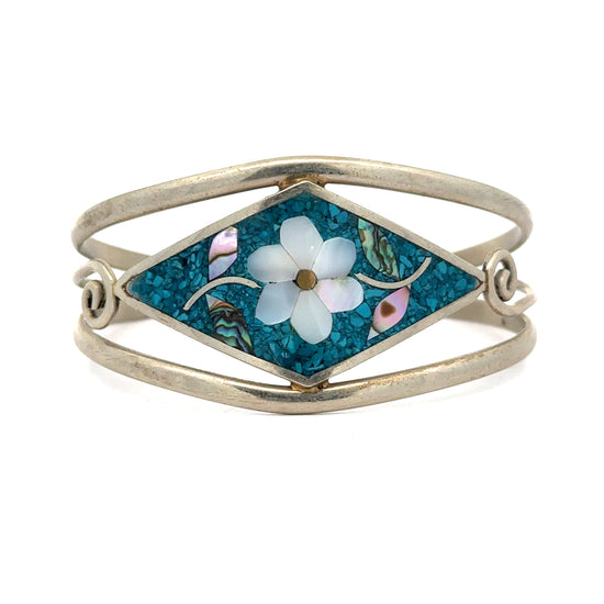 Living fully as both girl and goddess, this Mexican silver bracelet accented with crushed turquoise and genuine abalone shell reveals all of the feminine magic and mystery in you.