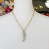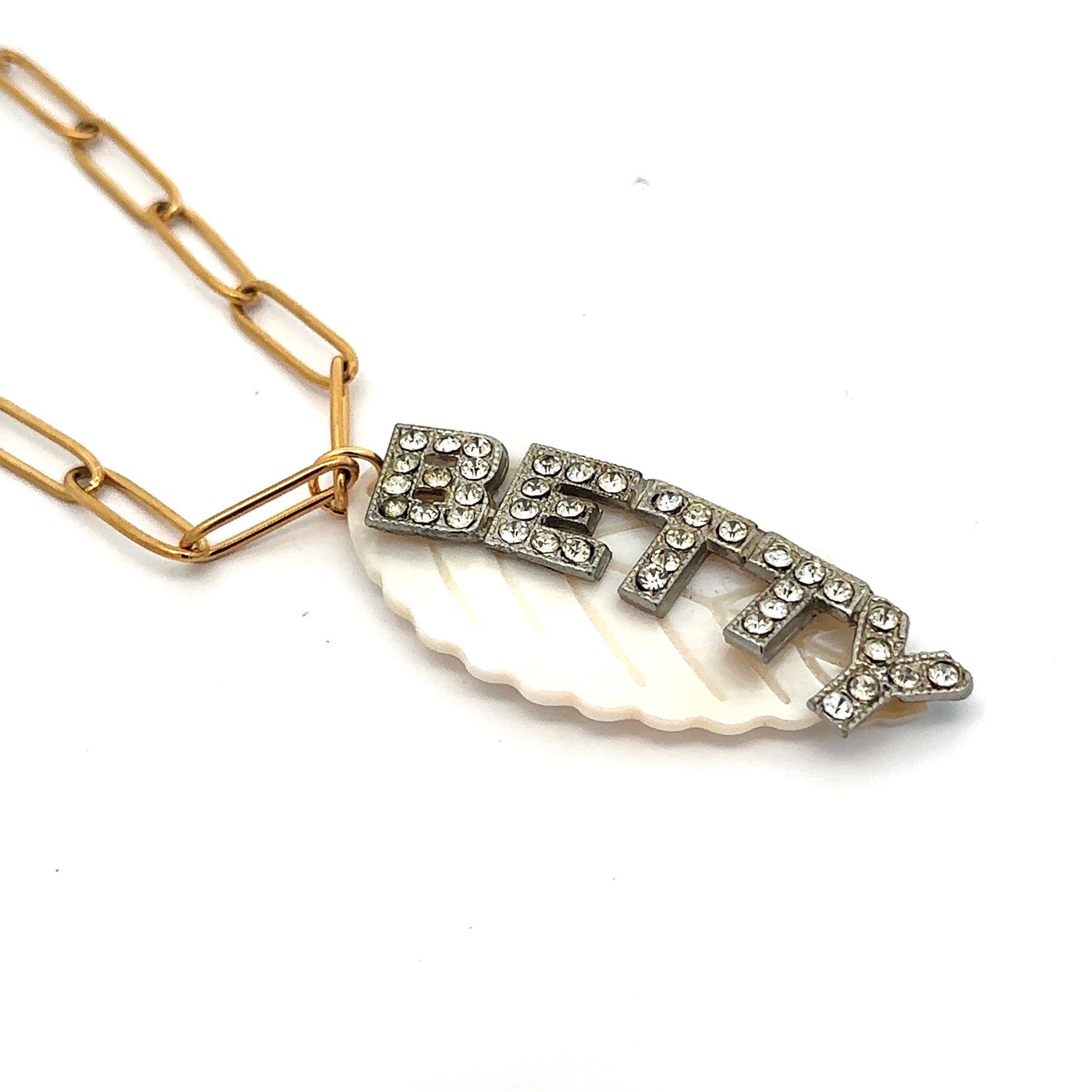 You don’t seek permission to be who you really are. You have your own inner authority and walk in it with courage and confidence…and plenty of sparkle! Walk in that beautiful confidence with this 1970's Rhinestone "Betty" pin layered over a mother of pearl leaf hung from gold paperclip chain!