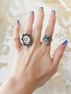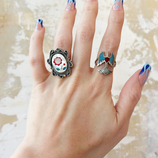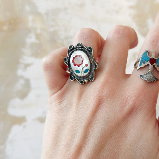 You consider jewelry to be poetry on your person, so you are naturally drawn to this beautiful 1970's silver ring with mother of pearl and flower detail!