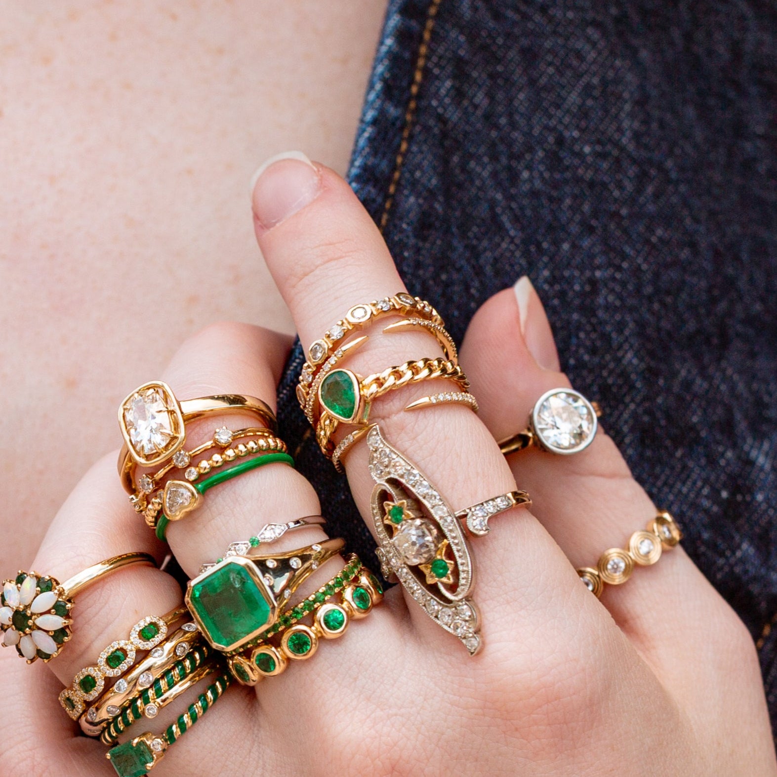 A 14k yellow gold ring weighing approximately 2.3 grams, featuring 1 natural Zambian pear-shaped emerald (approximately 0.30 carats). A pop of vibrant green that’s perfect for adding a little personality to any stack!