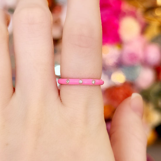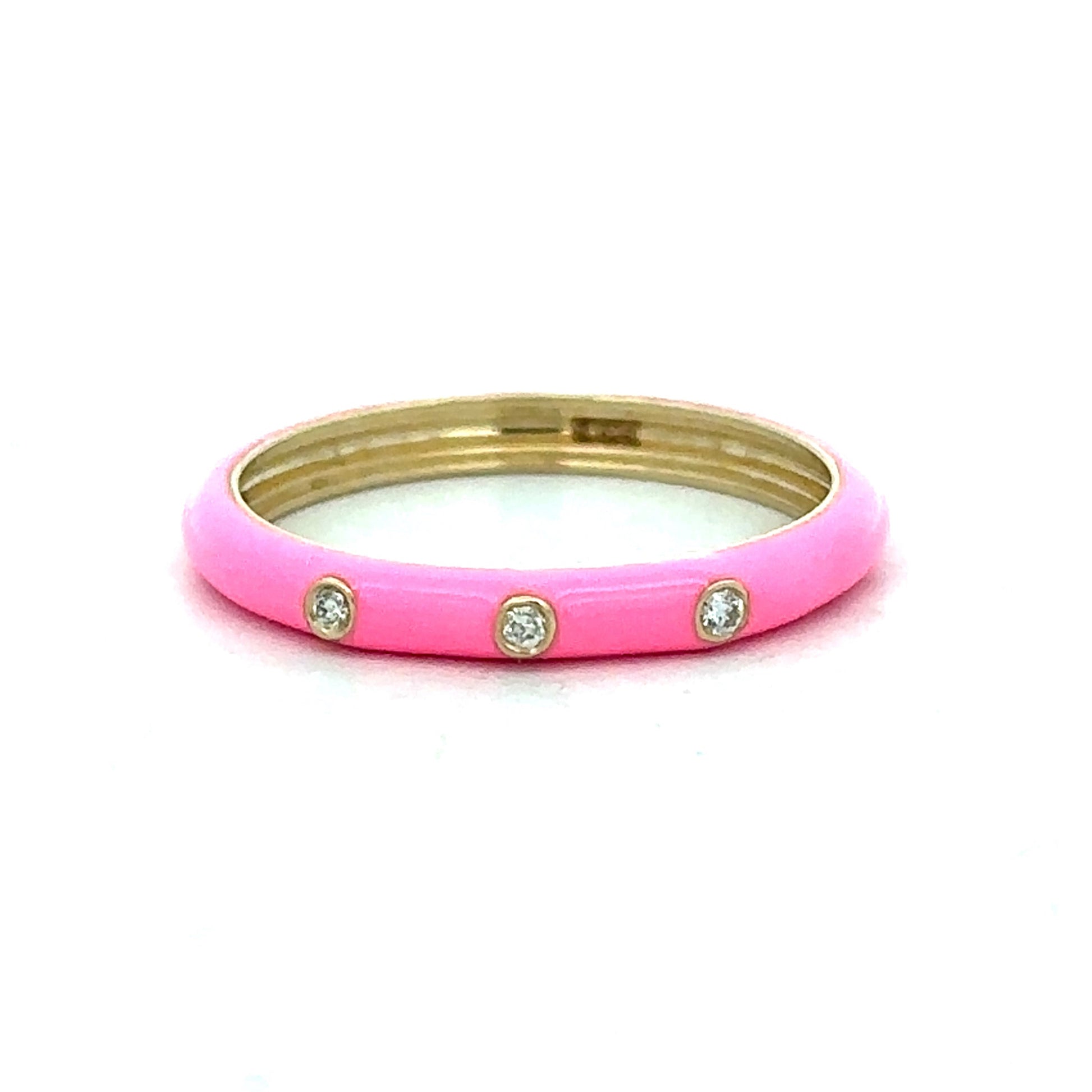 Add a POP of color and sparkle to your stack with a 14k gold enamel band in color Bubblegum. Three diamonds have a .03 carat weight, F Color and Si Clarity. Band is 2.5mm wide.