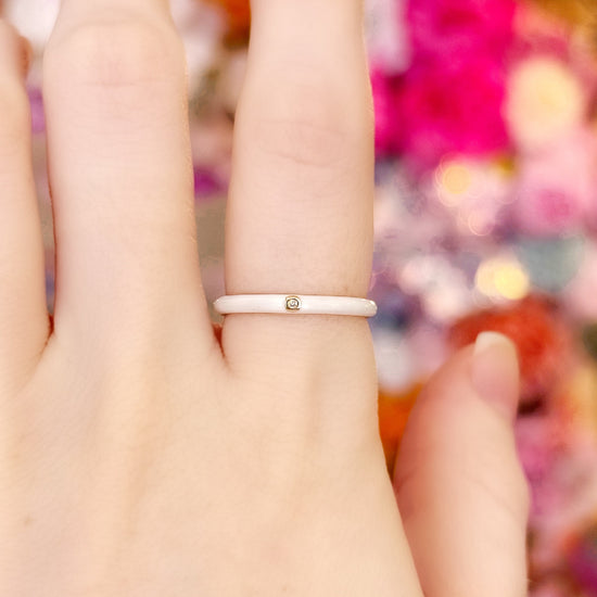 Add a POP of color and sparkle to your stack with a 14k gold enamel band in color Snow. One .05 carat diamond, F Color and Si Clarity. Band is 2.5mm wide.