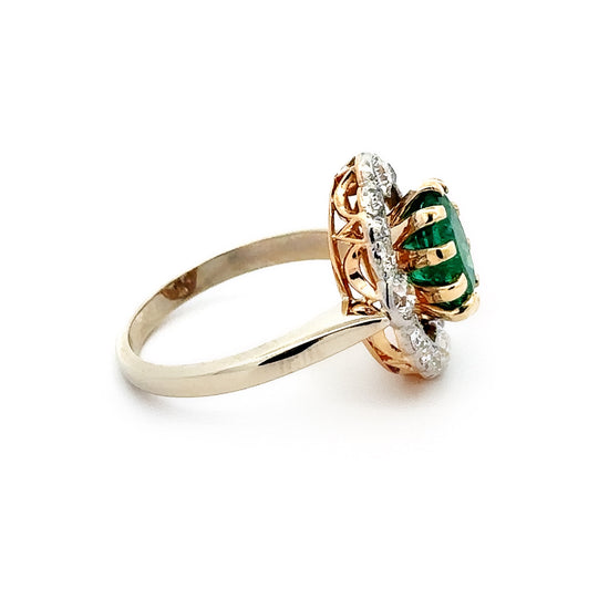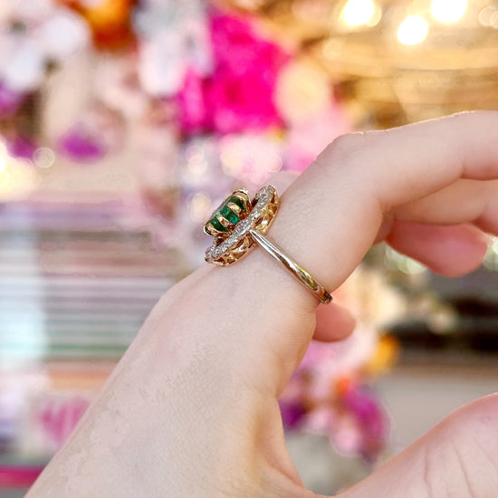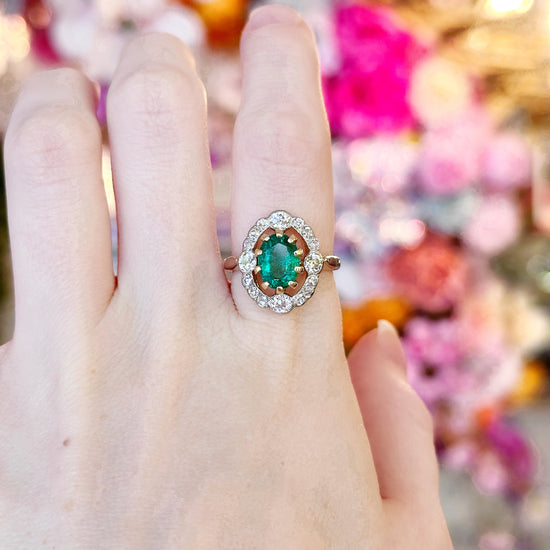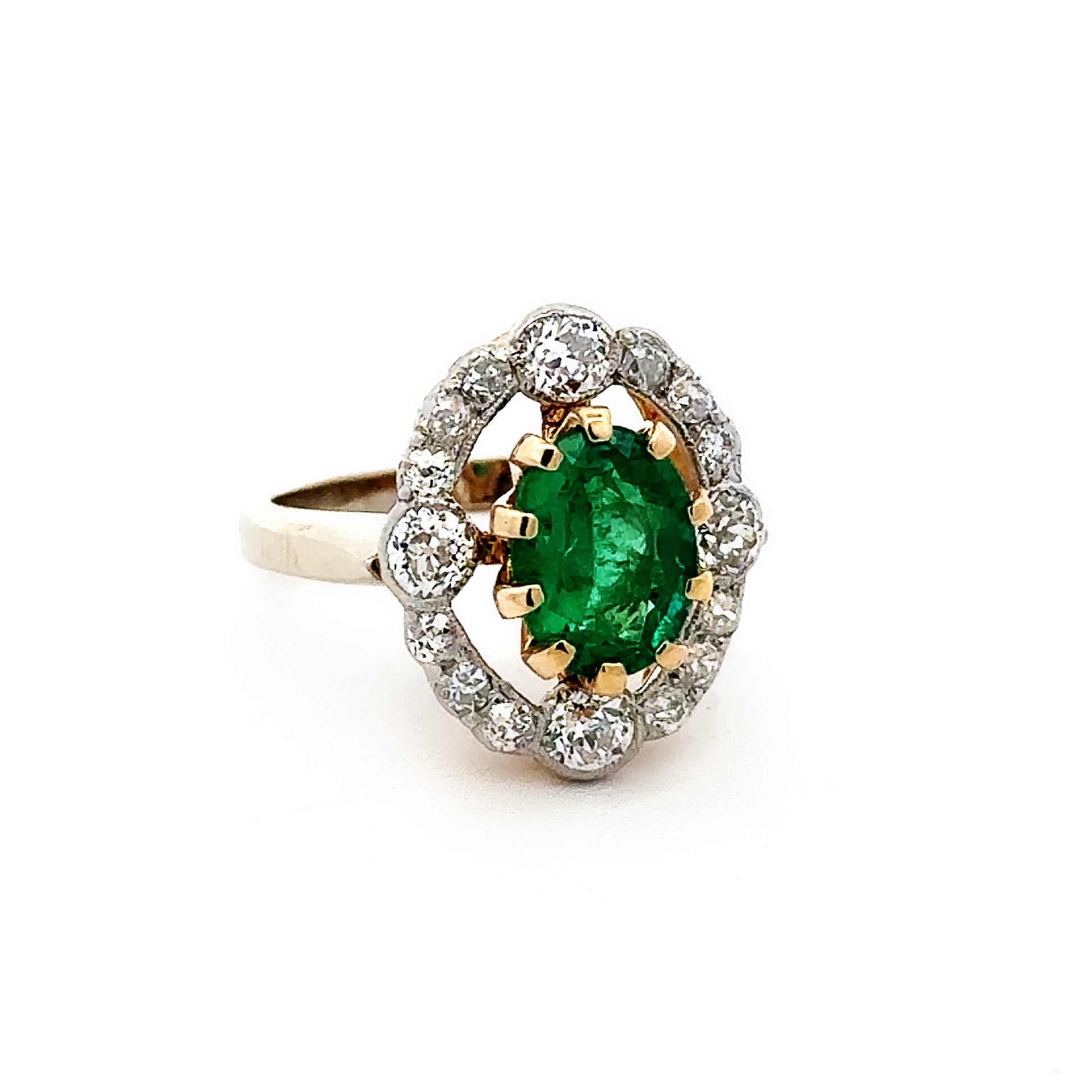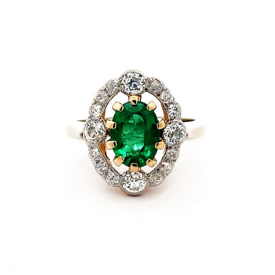 A 1930s 14k yellow and white gold ring (approx. 3 grams) featuring natural old mine cut diamonds (H color, VS/SI1 clarity, 0.66 ctw) and a natural Colombian emerald weighing 1.64 carats. A timeless vintage treasure.