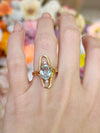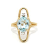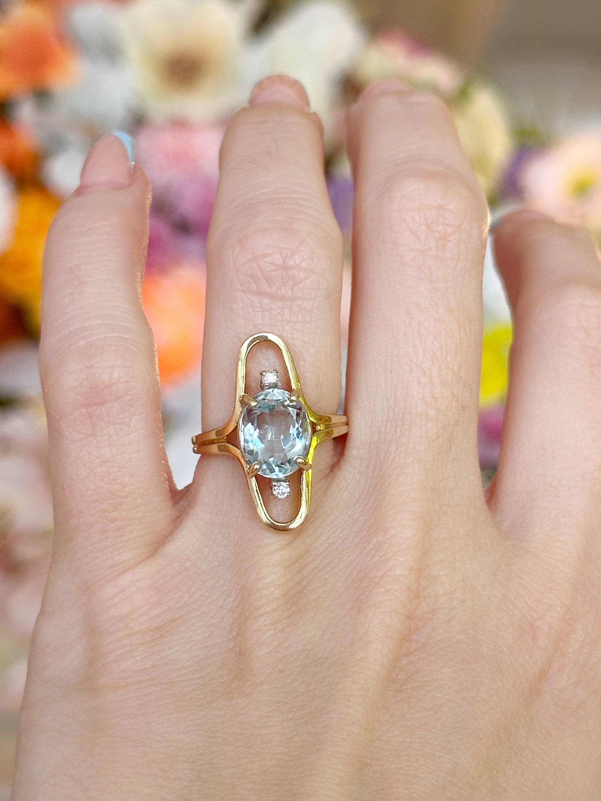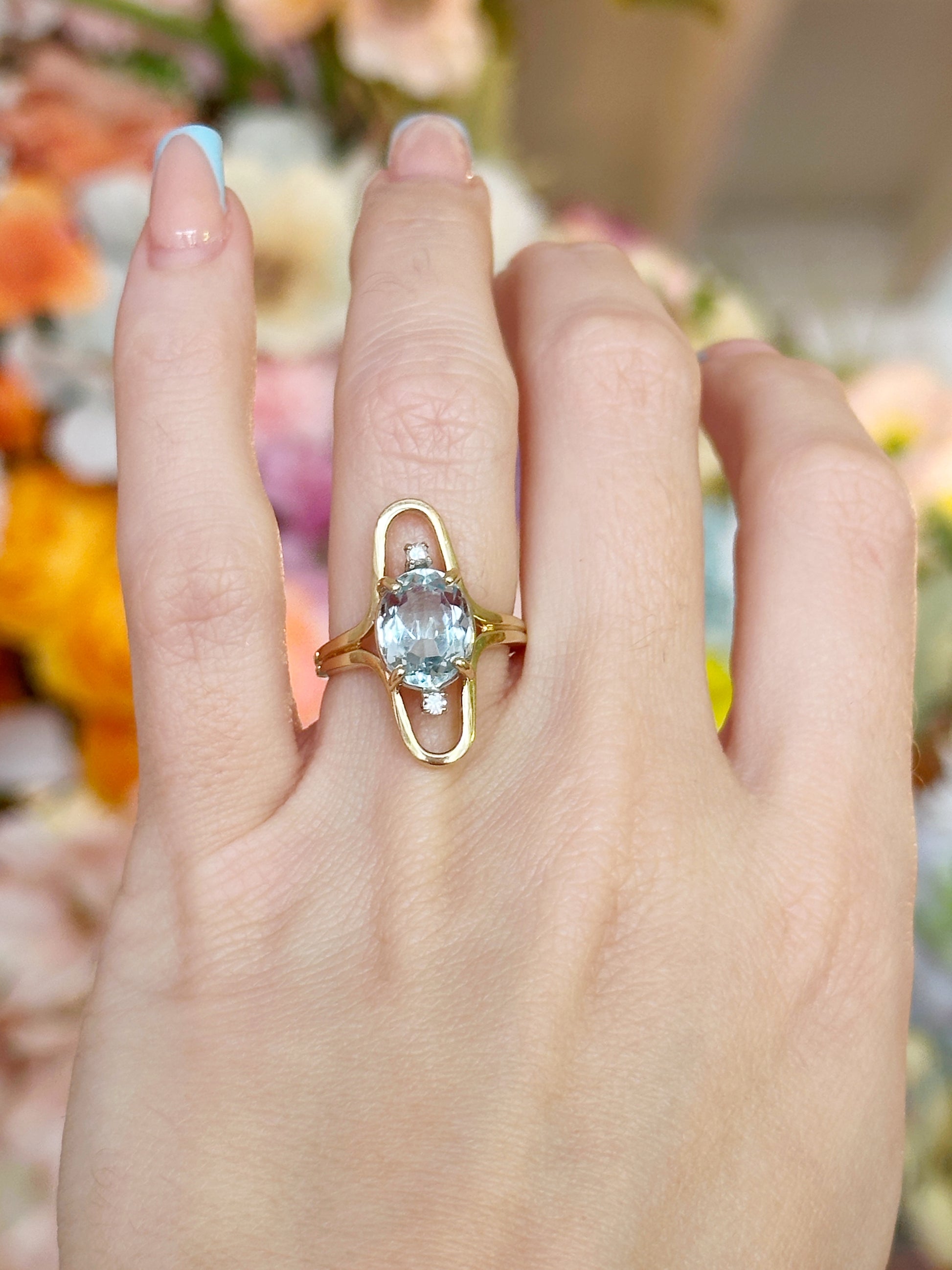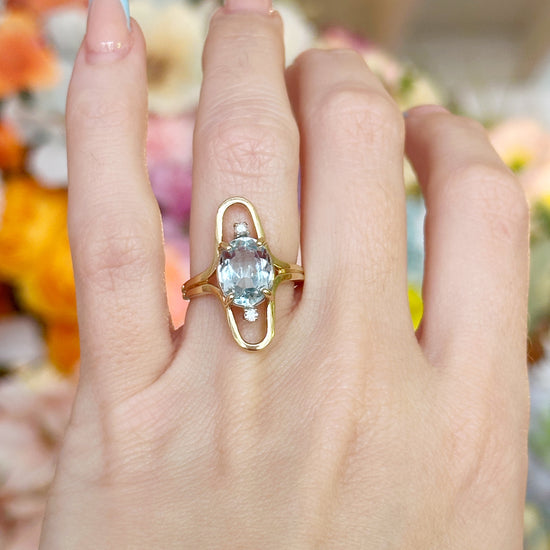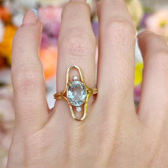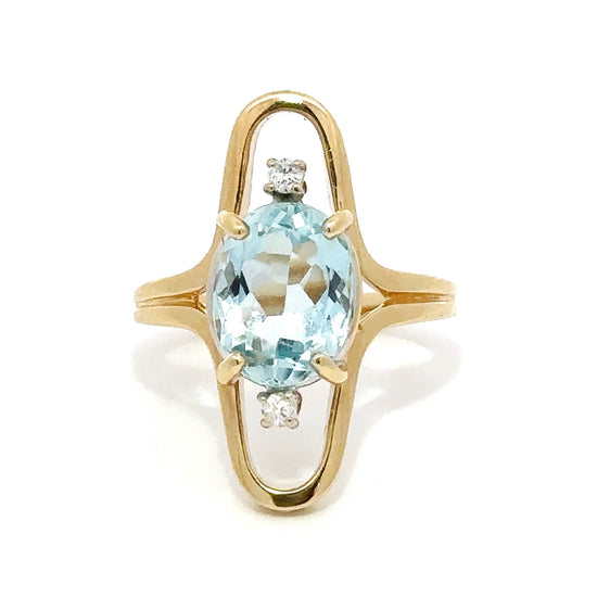 A 1970s 14k yellow gold open-frame ring shank featuring a 2.5-carat oval aquamarine and two 0.08-carat diamonds (SI2, I–J color). Bright, bold, and effortlessly vintage—this piece makes a sparkling statement!