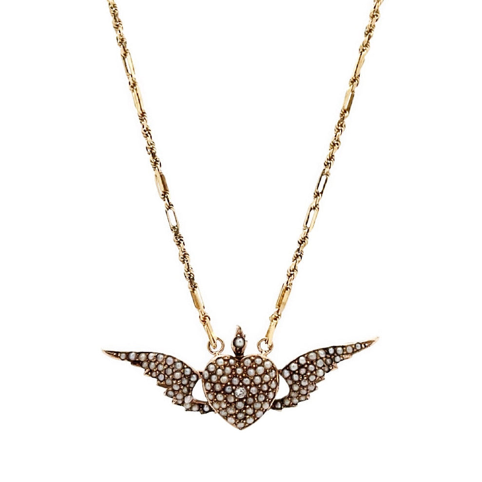 An 1880s winged heart necklace crafted in 14k yellow gold, adorned with seed pearls and delicate diamonds. Weighing approximately 7 grams, it’s a romantic Victorian treasure symbolizing love, protection, and grace.