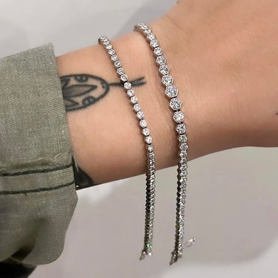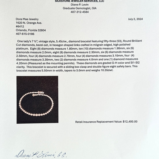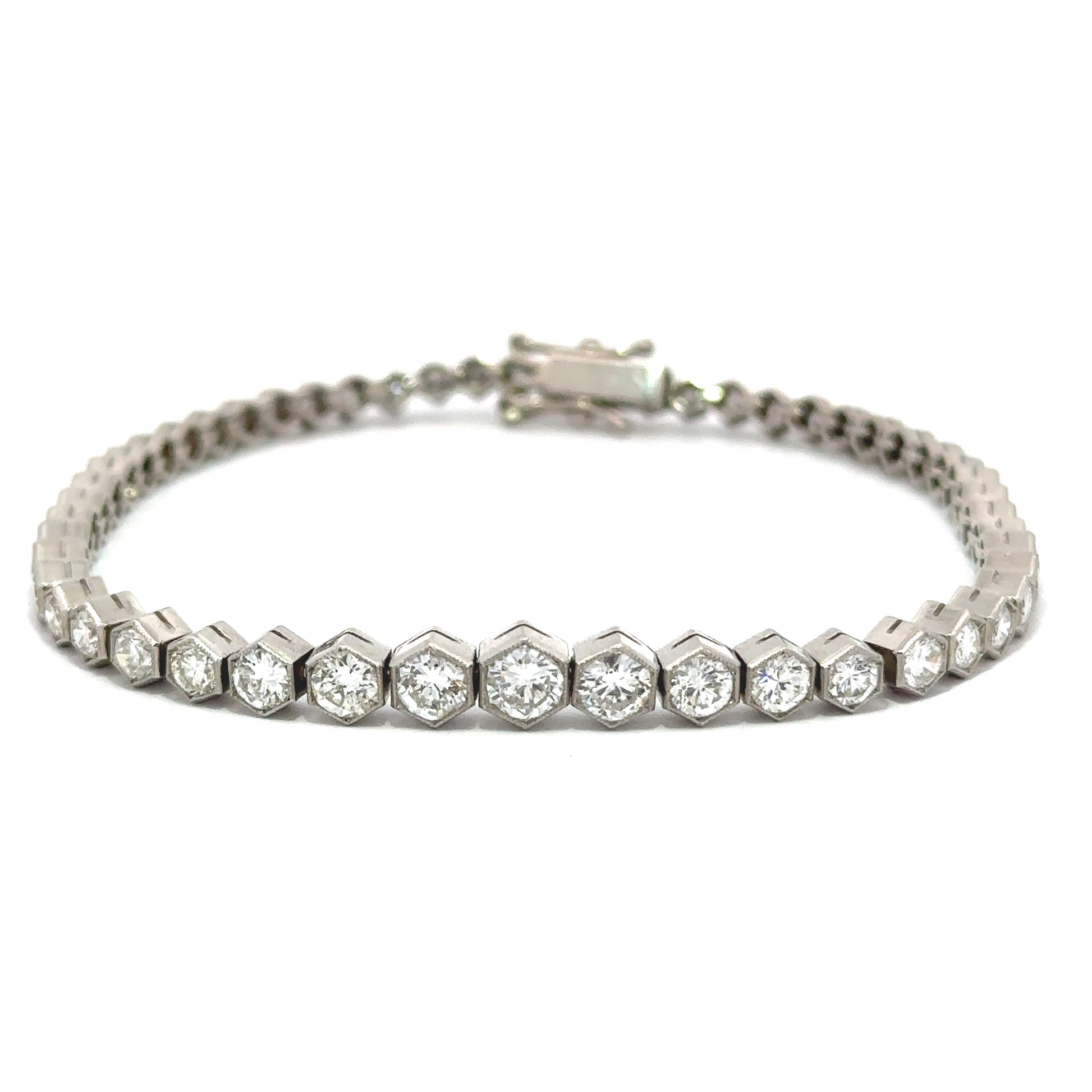53 Round Brilliant Cut diamonds, bezel-set, in hexagon shaped links crafted in milgrain edged, high polished platinum