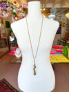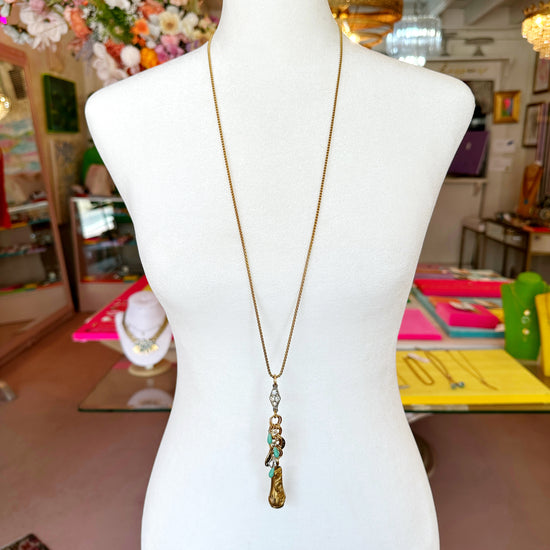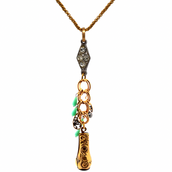 Your outfit is your Aura. You ensemble is made of energy. You are dressed in Undeniable Alreadyness. And you top it off with this brass and turquoise tassel accented with a 1940's paste rhinestone connector and hung from a tarnish free gold chain!