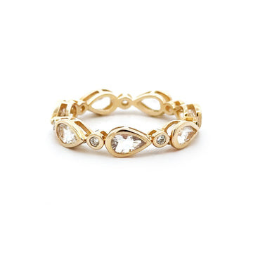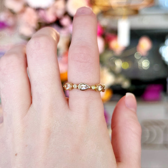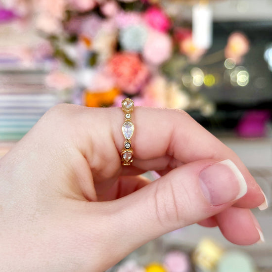 A 14k yellow gold ring featuring 0.16 total carats of natural diamonds (VS1 clarity, EF color) and 7 teardrop-cut natural moonstones. A dreamy mix of sparkle and soft glow that adds whimsical charm to any stack!