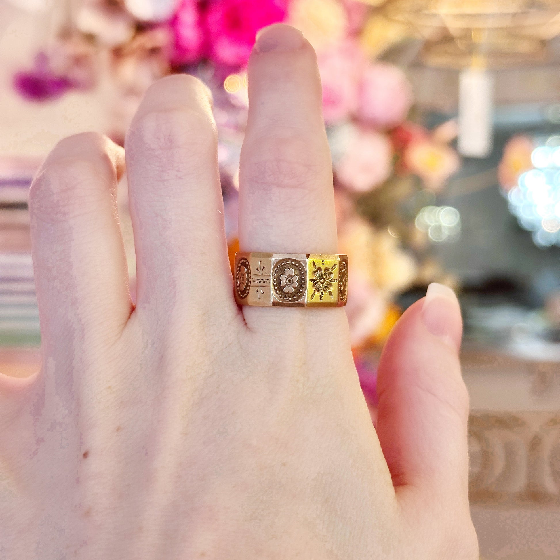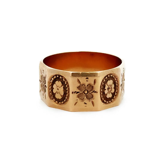 An 1890s hand-engraved Victorian ring crafted in 14k yellow gold, weighing 4.21 grams. Richly detailed with antique engraving, this bold and timeless piece was made to turn heads.
