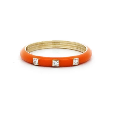 Orange enamel over 14k gold, featuring 3 princess-cut diamonds.
