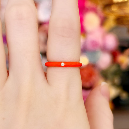 Add a POP of color and sparkle to your stack with a 14k gold enamel band in color Electric Orange. One .05 carat diamond, F Color and Si Clarity. Band is 2.5mm wide.
