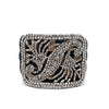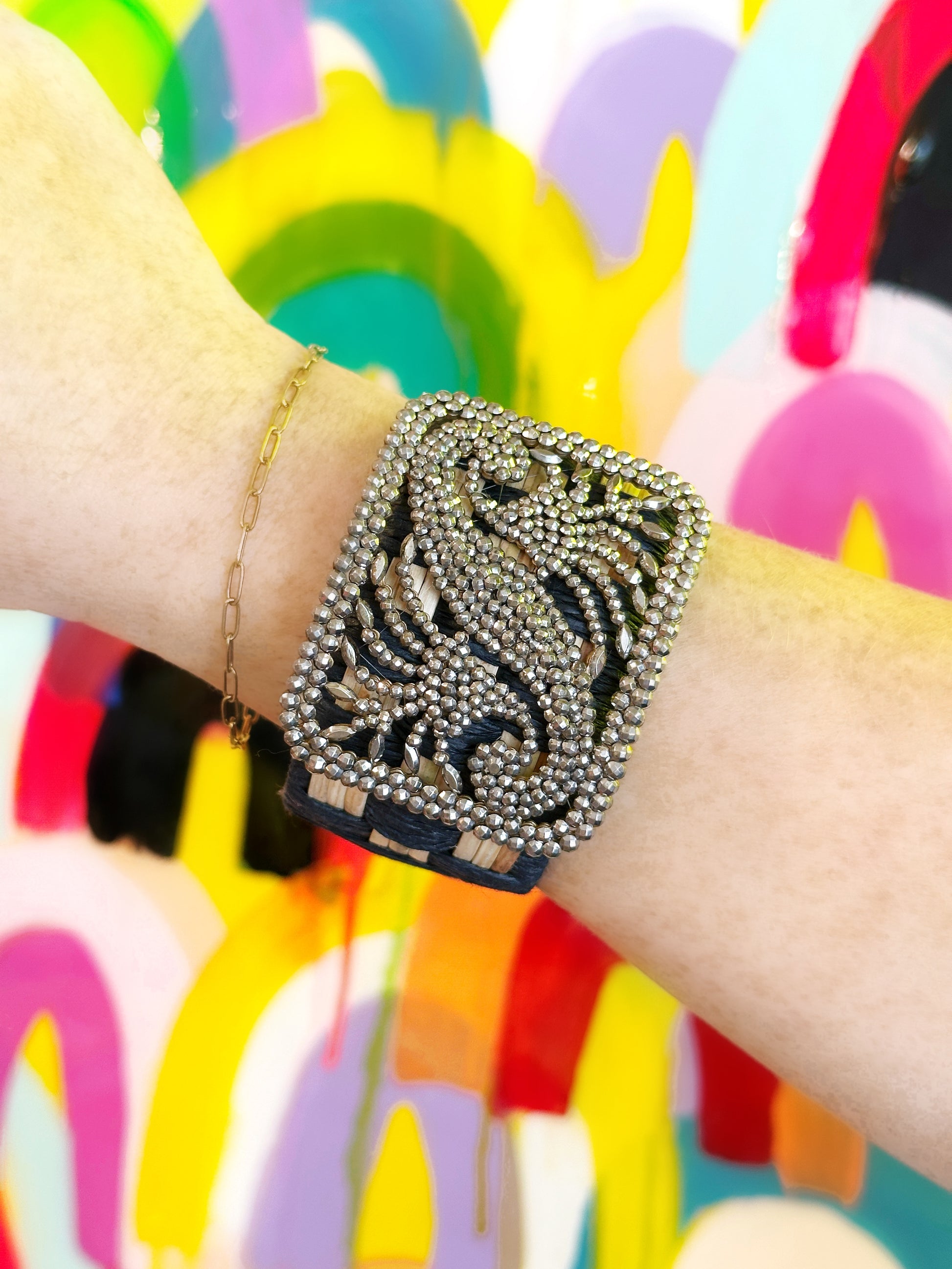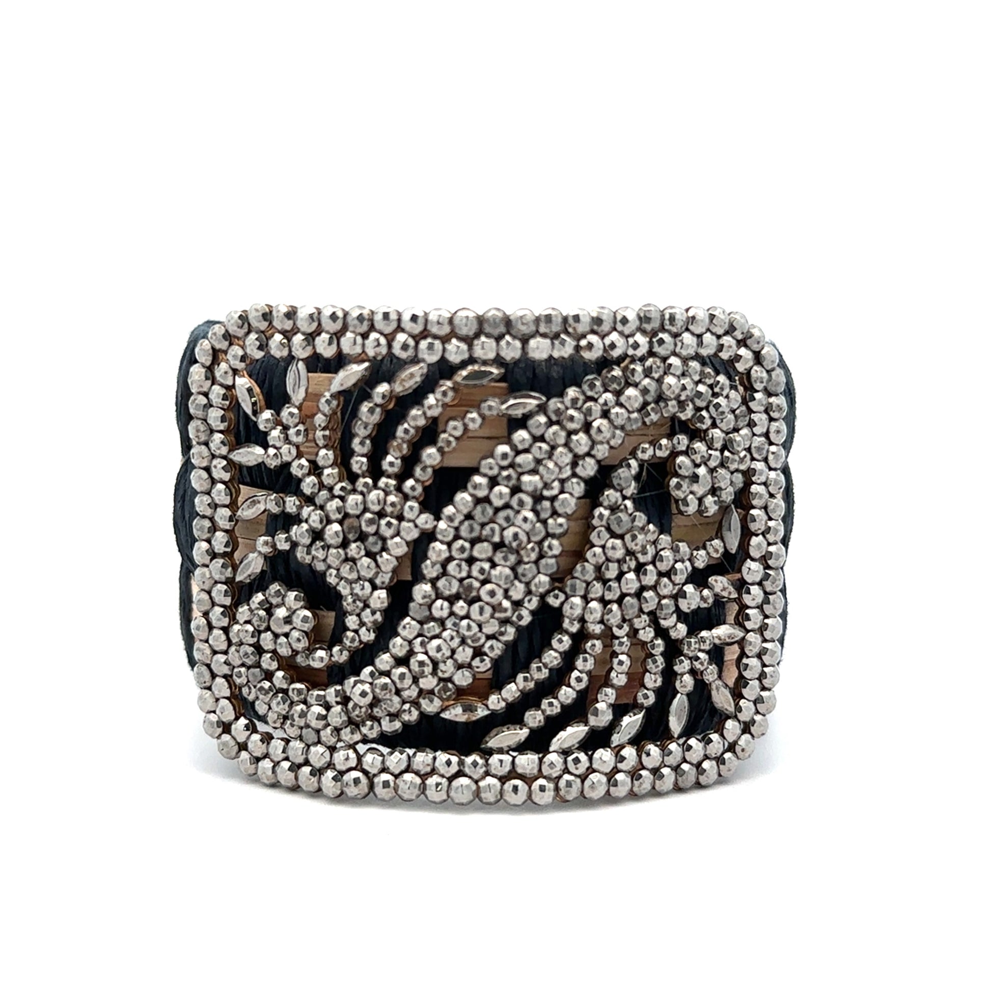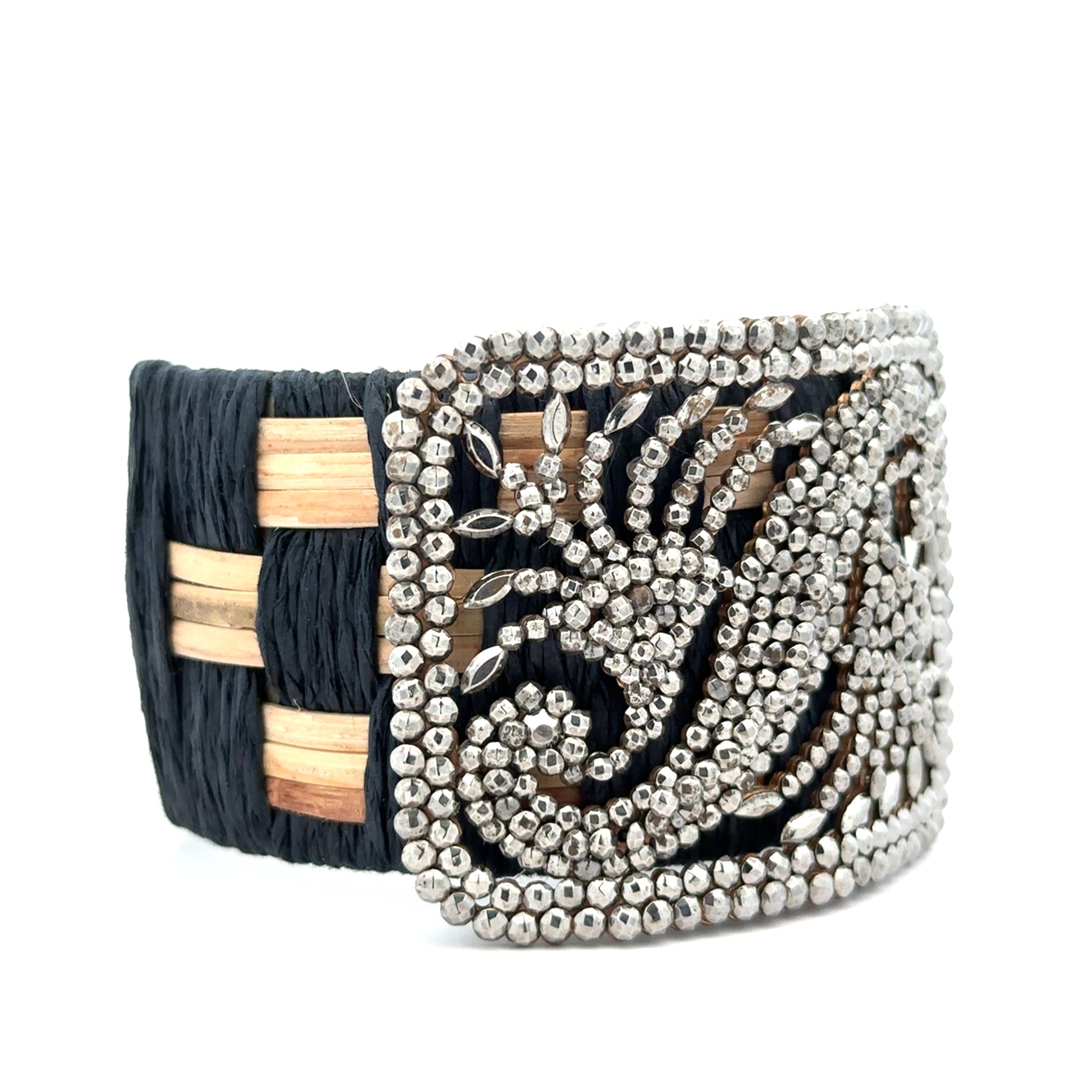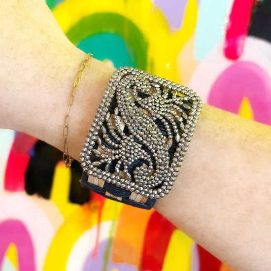 You consider jewelry to be poetry on your person, so you are naturally drawn to this beautiful 1950's marcasite cluster layered over a black and tan woven cuff!