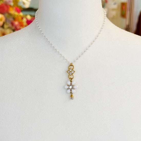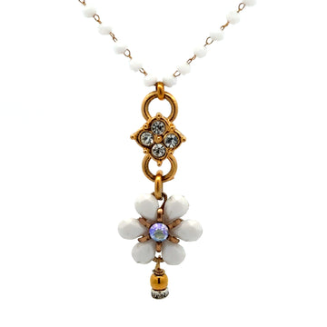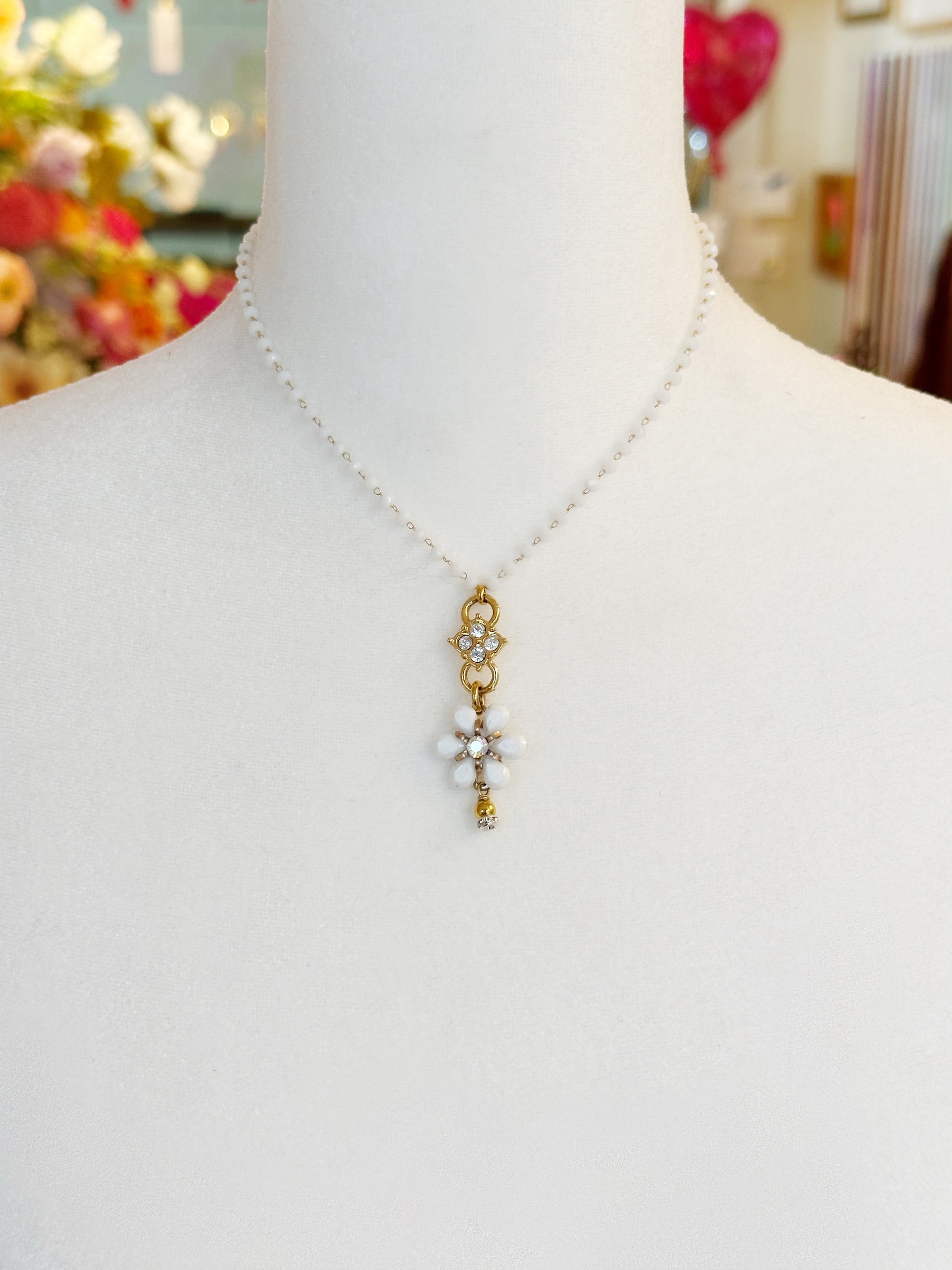 Your outfit is your Aura. You ensemble is made of energy. You are dressed in Undeniable Alreadyness. And you top it off with this 1970's flower charm accented with gold rhinestone pendant hung from white beaded chain!