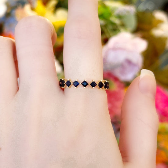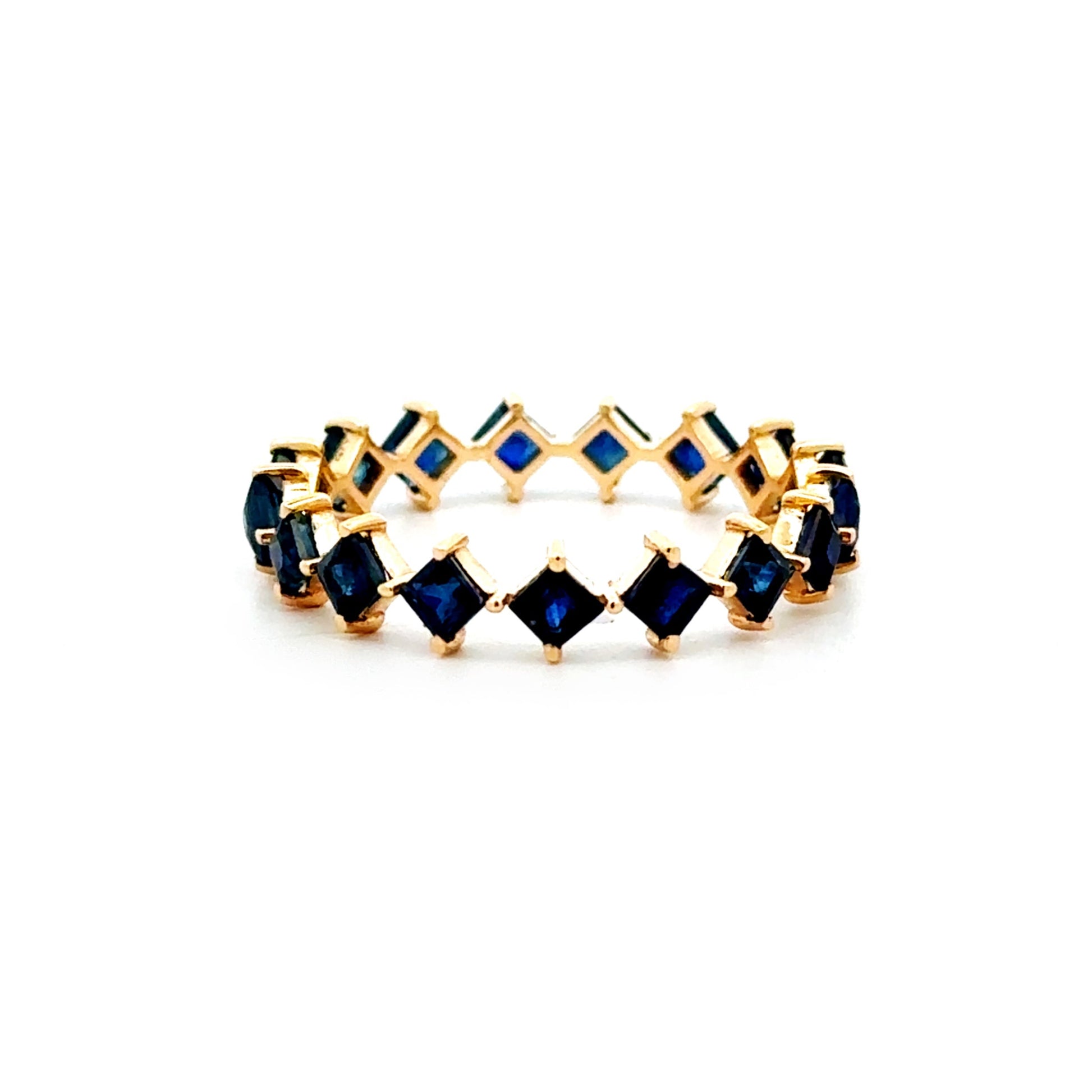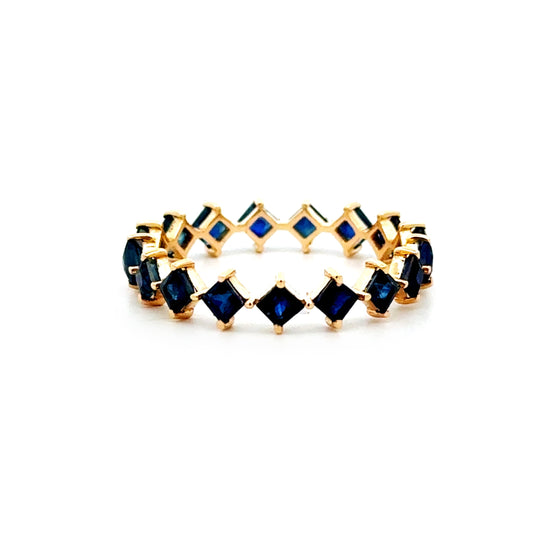 "Neala" in her original form is a 14k yellow gold princess-cut eternity band (1.17 grams) featuring 2.10 carats of blue sapphires. Sleek, vibrant, and endlessly chic—perfect for stacking or wearing solo!