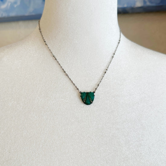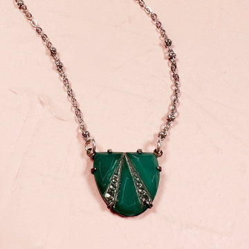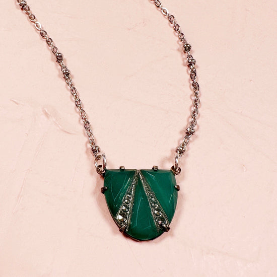 You consider jewelry to be poetry on your person, so you are naturally drawn to this unique 1940's art deco green class and marcasite charm hung on stainless steel chain!