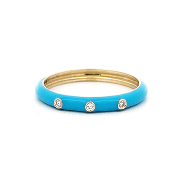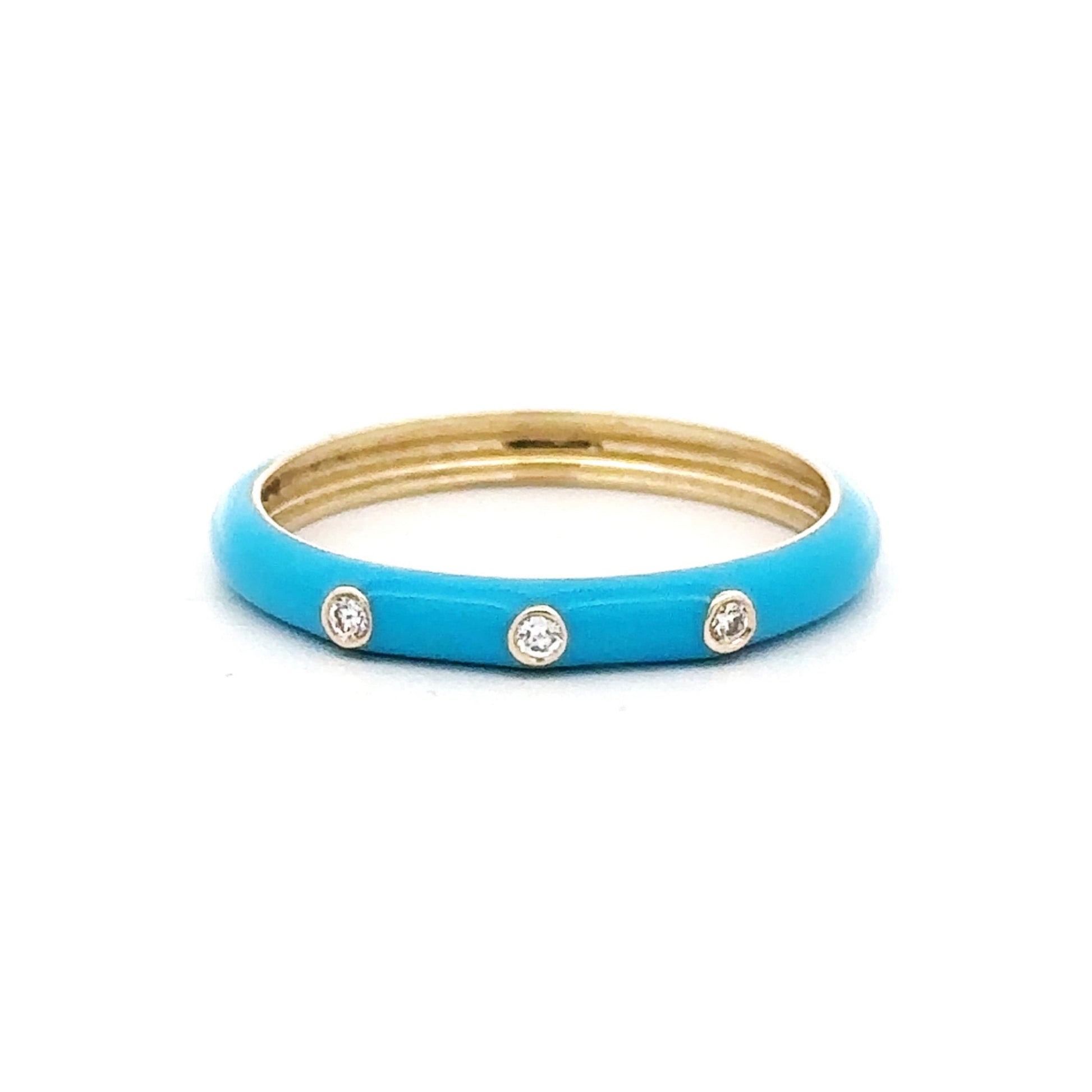 Add a POP of color and sparkle to your stack with a 14k gold enamel band in color Capri Blue. Three diamonds have a .03 carat weight, F Color and Si Clarity. Band is 2.5mm wide.