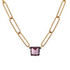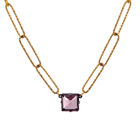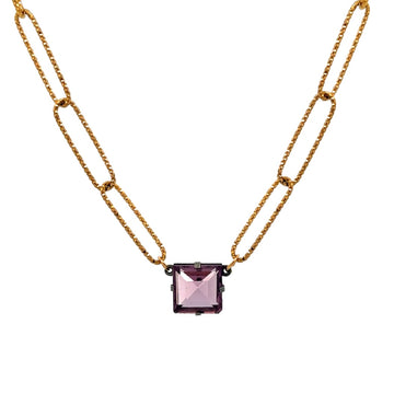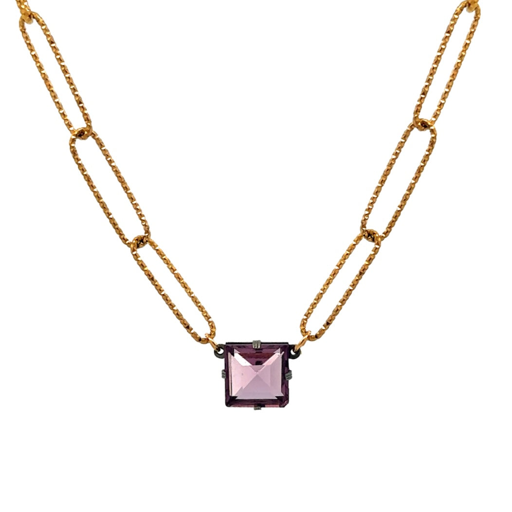 That sparkle in your eye is only matched by the sparkle in this sterling and paste purple rhinestone hung from etched gold paperclip chain!