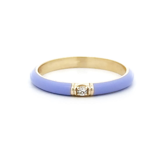 Add a POP of color and sparkle to your stack with a 14k gold enamel band in color Lilac. The diamonds has a .02 carat weight, F Color and Si Clarity. Band is 2.5mm wide.